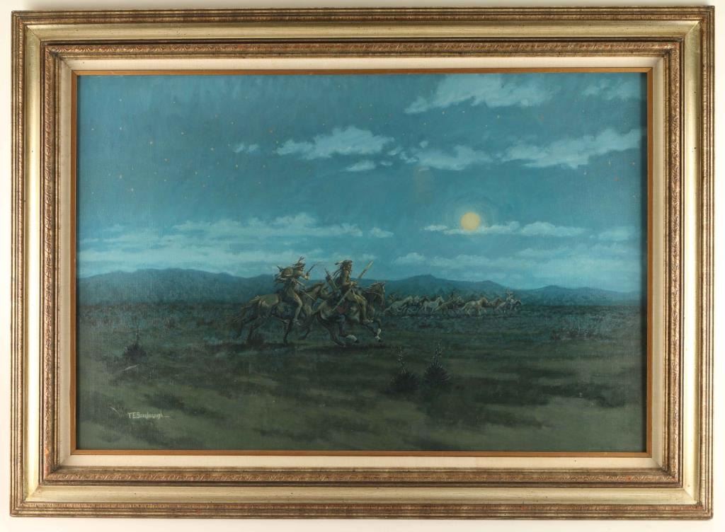 by Colorado artist T.E. Scarborough depicts Indians on horseback at night, signed lower left, measures 36"x24" in pewter wood frame.