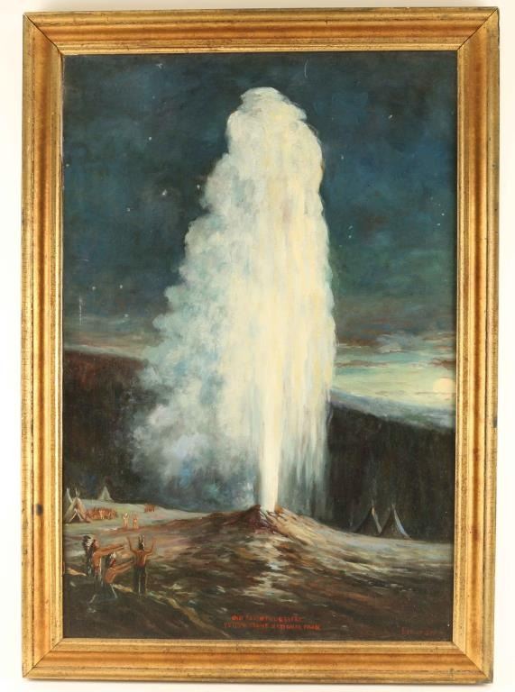 Depicting Native Americans watching Old Faithful. Signed by artist lower right, center reads 'Old Faithful Geyser Yellowstone National Park'. Image measures 29 3/4" x 20" in gold wood frame that has part of inner left side missing. Very unique painting.