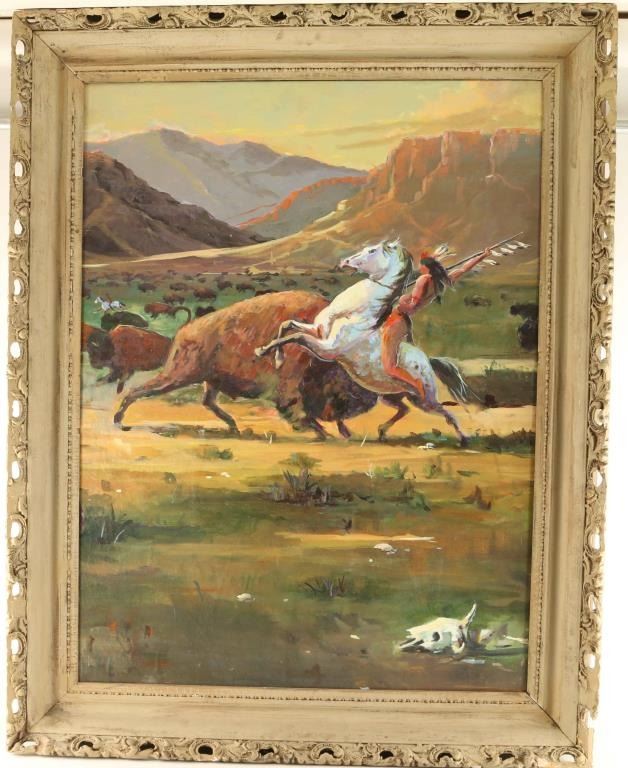 Unsigned depicting Indian at a buffalo hunt, measures 40"x29 1/2" in wood painted frame.
