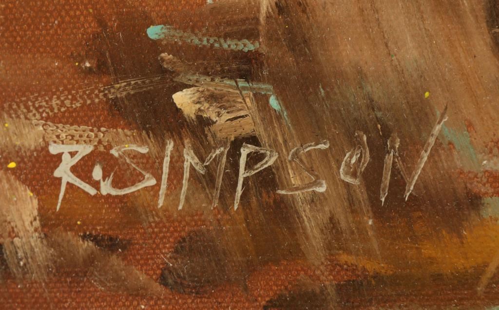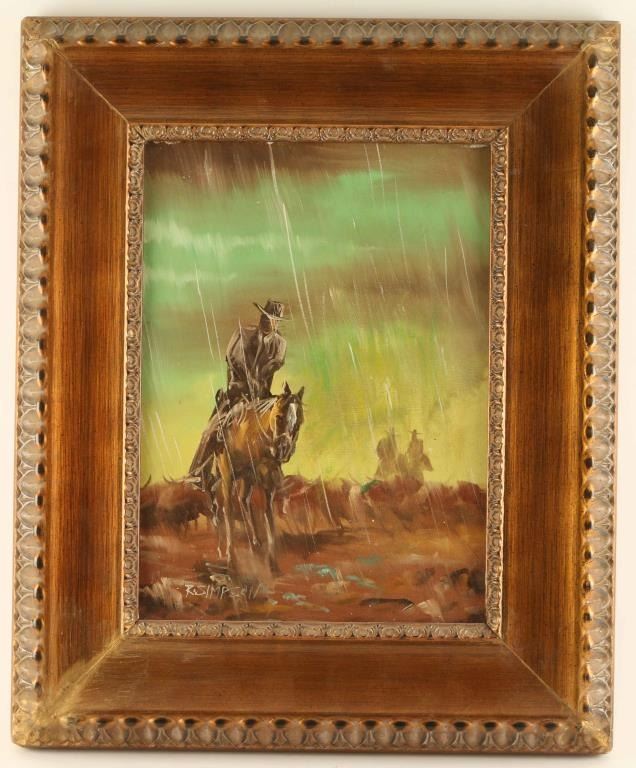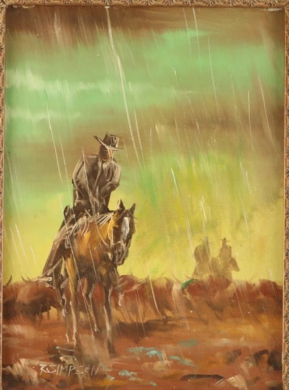 by R. Simpson depicts a cowboy on horseback in the rain measures 15 1/2" x 11" signed lower left in gold wood frame. Has a 1" tear on right center of canvas.