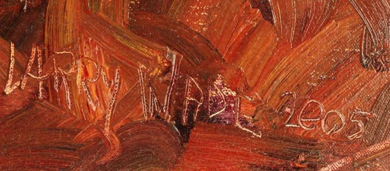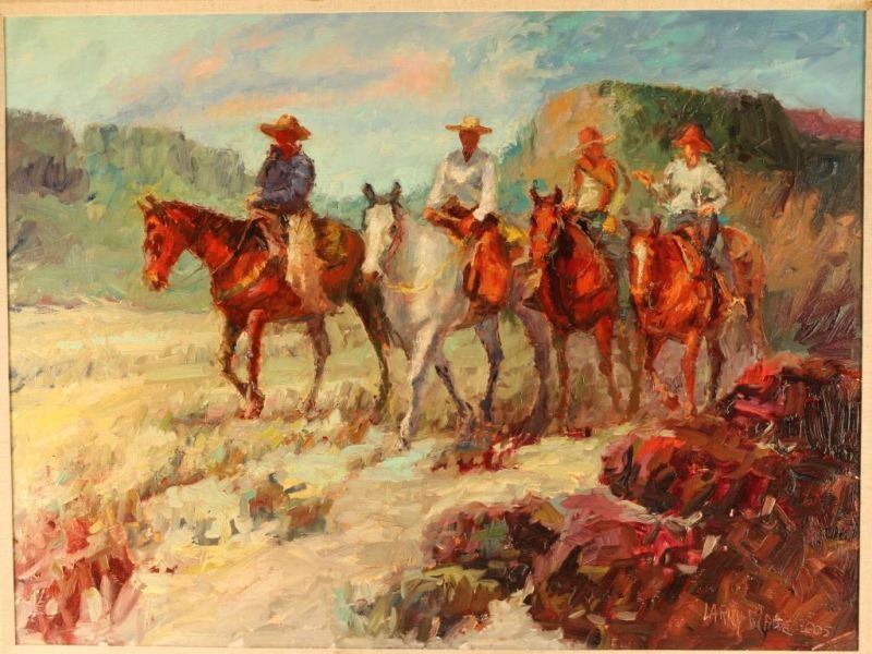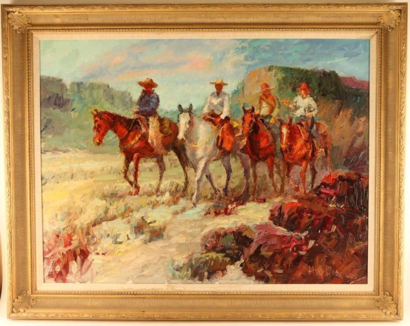 by Larry Wade, image size 39"x31", depicting cowboys on horse back, signed lower right, gold gilt frame. Larry C. Wade (Born 1938) is active/lives in Utah. Larry Wade is known for Rural farm landscapes & plein-air oils.