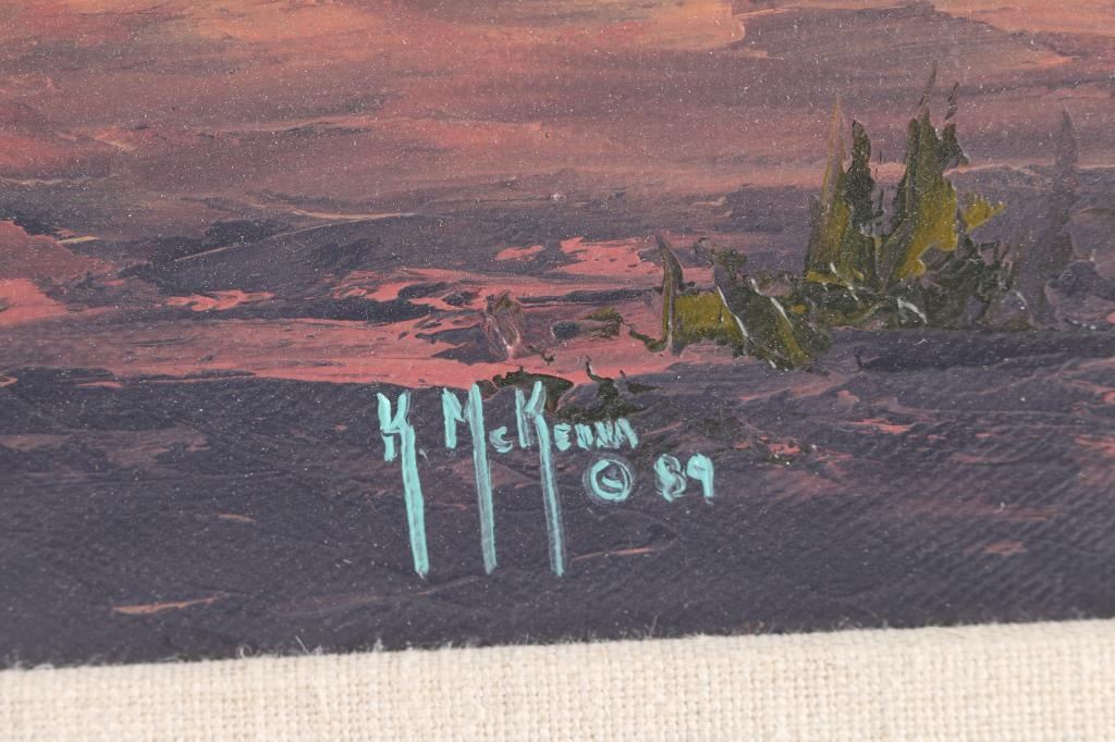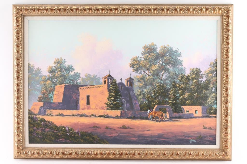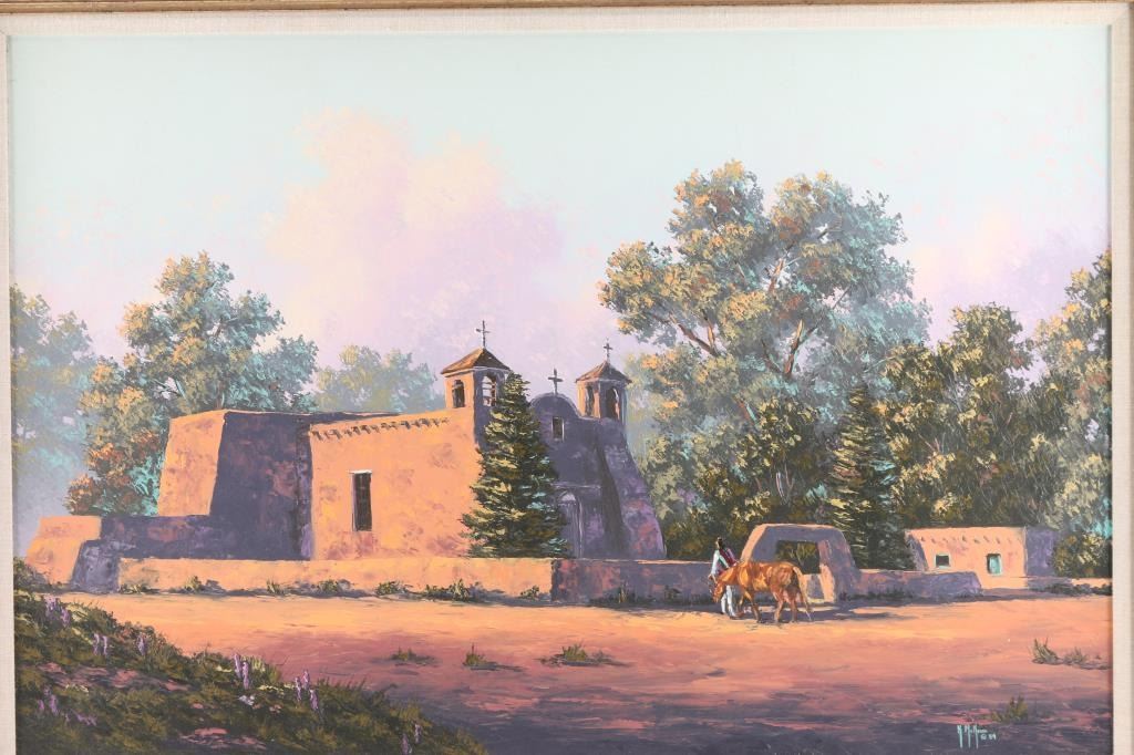 By Kenny McKenna. Depicting adobe mission, hand signed lower right hand corner. 29 x 20". Kenny McKenna, born 1950, is active, lives in Oklahoma and Kansas. Best known for his landscape painting. In ornate gold frame. From the Estate of Steve Goldstein, Scottsdale, AZ.