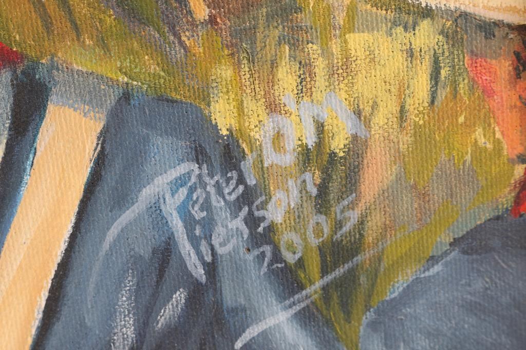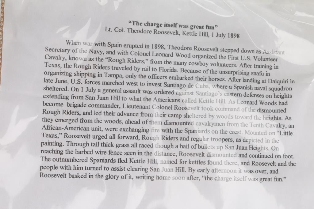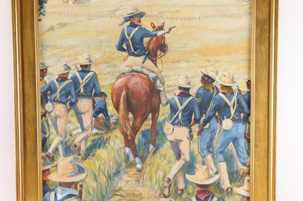 By Peter Pierson. Signed lower right. Entitled "The Charge Itself Was Great Fun Lt. Colonel Theodore Roosevelt. Kettle Hill July 1, 1898." In gold frame. 29 x 23".