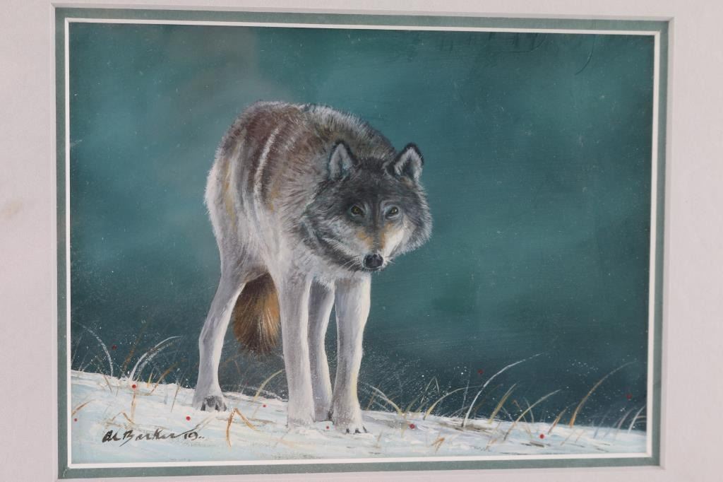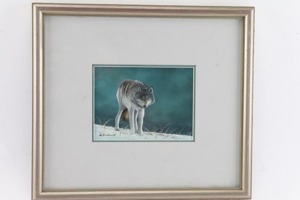 Signed lower left. Depicting wolf in the snow. 5 1/2 x 4".