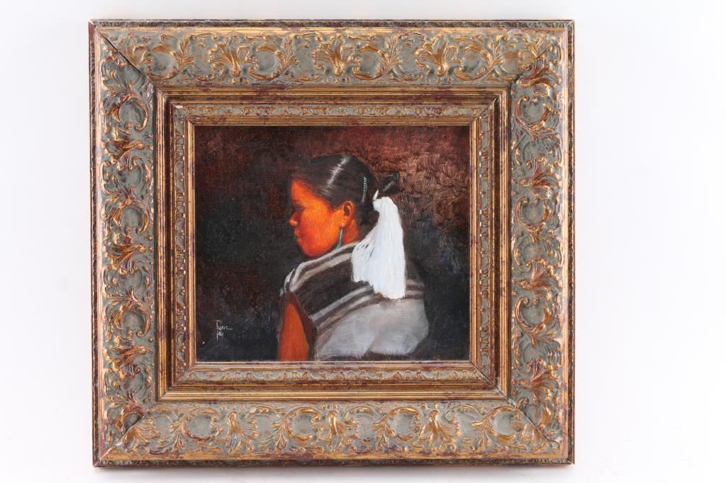 By Paul Tsosie. Depicting indian girl, 9 1/2 x 9". Signed, in heavy ornate gold washed frame. From the Estate of Steve Goldstein, Scottsdale, AZ.