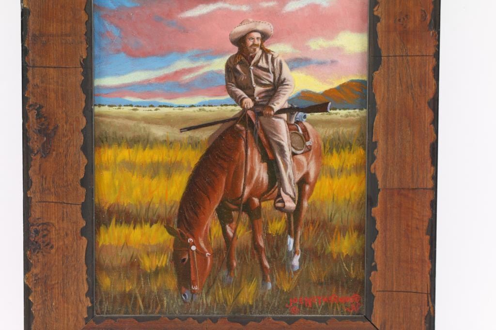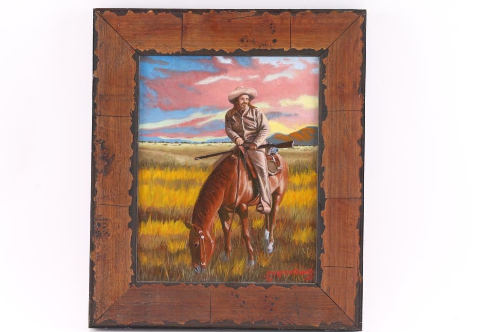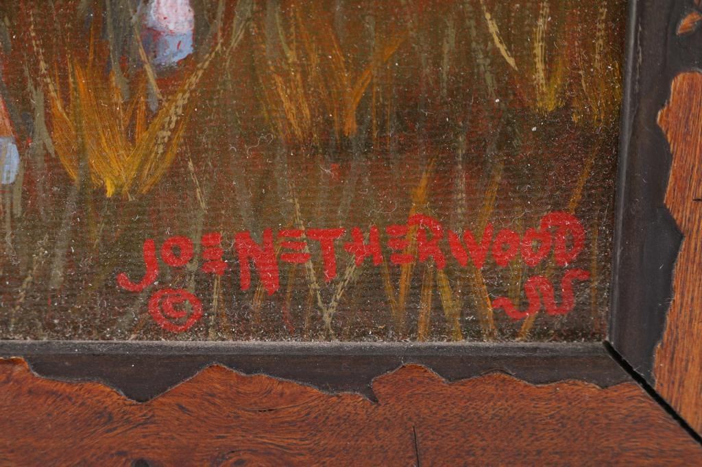 Entitled "Against a Crooked Sky" by Joe Netherwood. Painting is 10" x 8", framed in black with knotted brown wood design frame it measures 11 1/2" by 131/2".