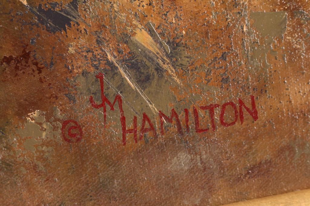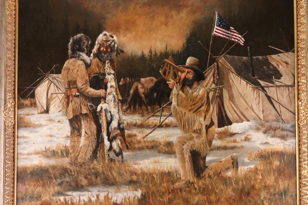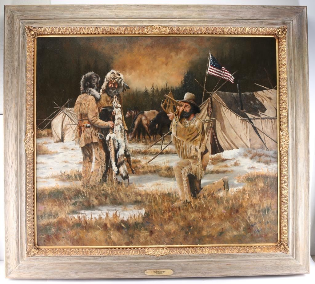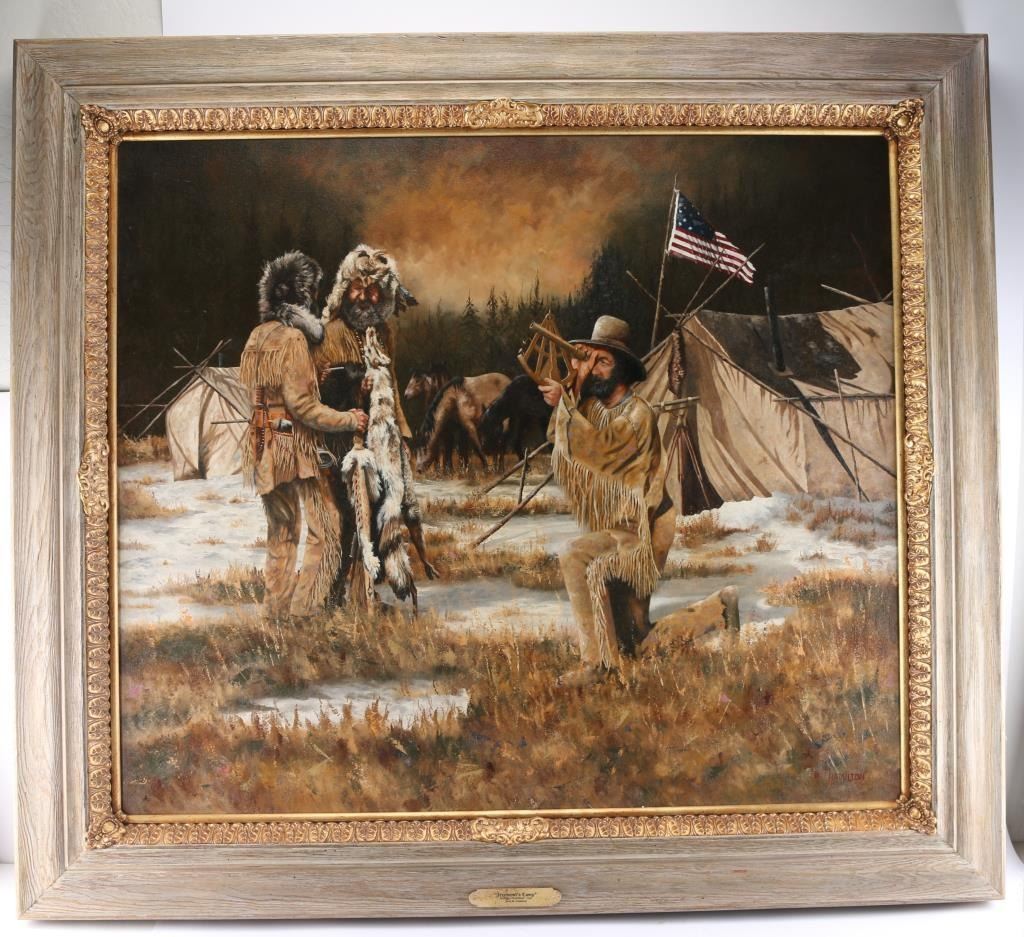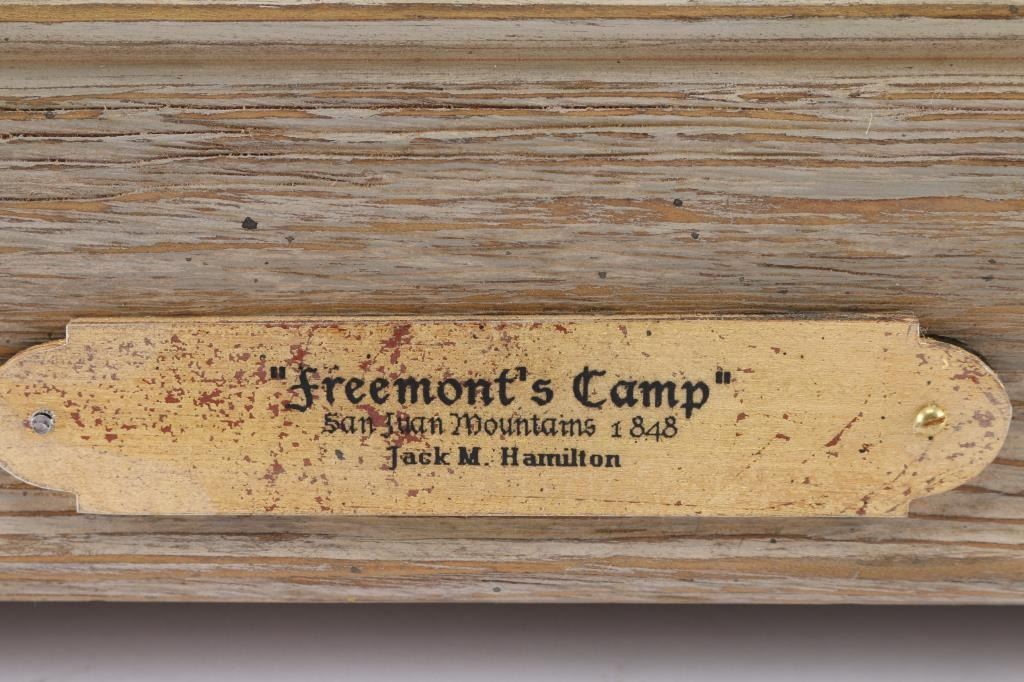 By Colorado artist, Jack M. Hamilton, entitled "Freemont's Camp, San Juan Mountains 1848." Hamilton loved the outdoors, nature's wildlife and American history. He spent years watching, studying and photographing his favorite subjects, often from his working cattle ranch in southern Colorado. Painting on both canvas and panel, Jack worked entirely in the medium of oil. Self-taught, Jack painted in the manner of the old masters. Hamilton was exhibited at many of the country's finest galleries and at many fine art shows. His work has been featured on the cover of, as well as in, national magazines. Painting measures 40" x 46"; 51" x 58 1/2" with frame. Framed in natural wood and gold frame.
