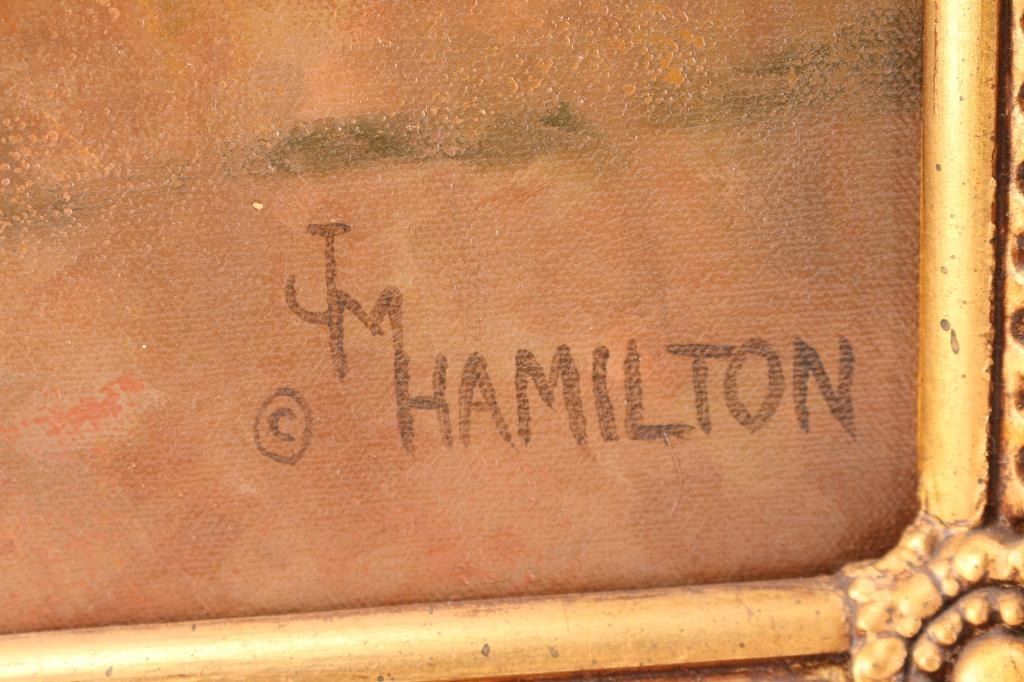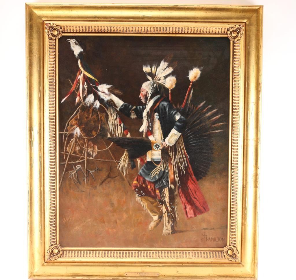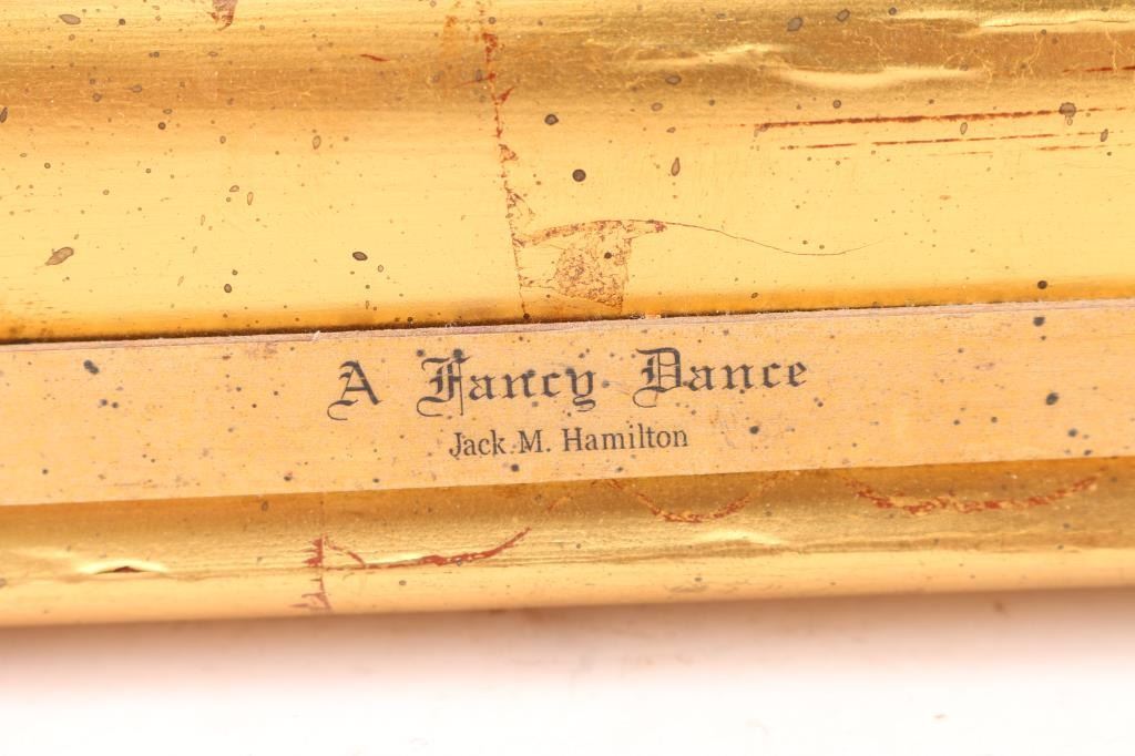 By Colorado artist, Jack M. Hamilton, entitled "The Fancy Dance". Hamilton loved the outdoors, nature's wildlife and American history. He spent years watching, studying and photographing his favorite subjects, often from his working cattle ranch in southern Colorado. Painting on both canvas and panel, Jack worked entirely in the medium of oil. Self-taught, Jack painted in the manner of the old masters. Hamilton was exhibited at many of the country's finest galleries and at many fine art shows. His work has been featured on the cover of, as well as in, national magazines. The original price of this piece: $13,000.