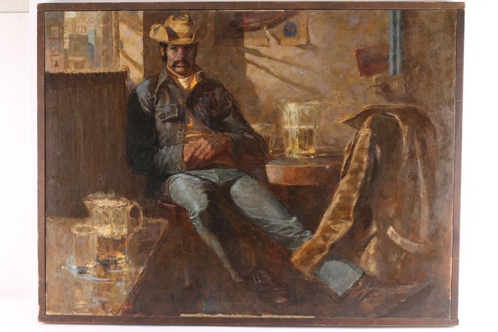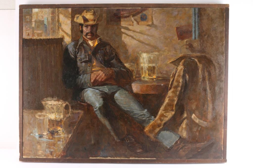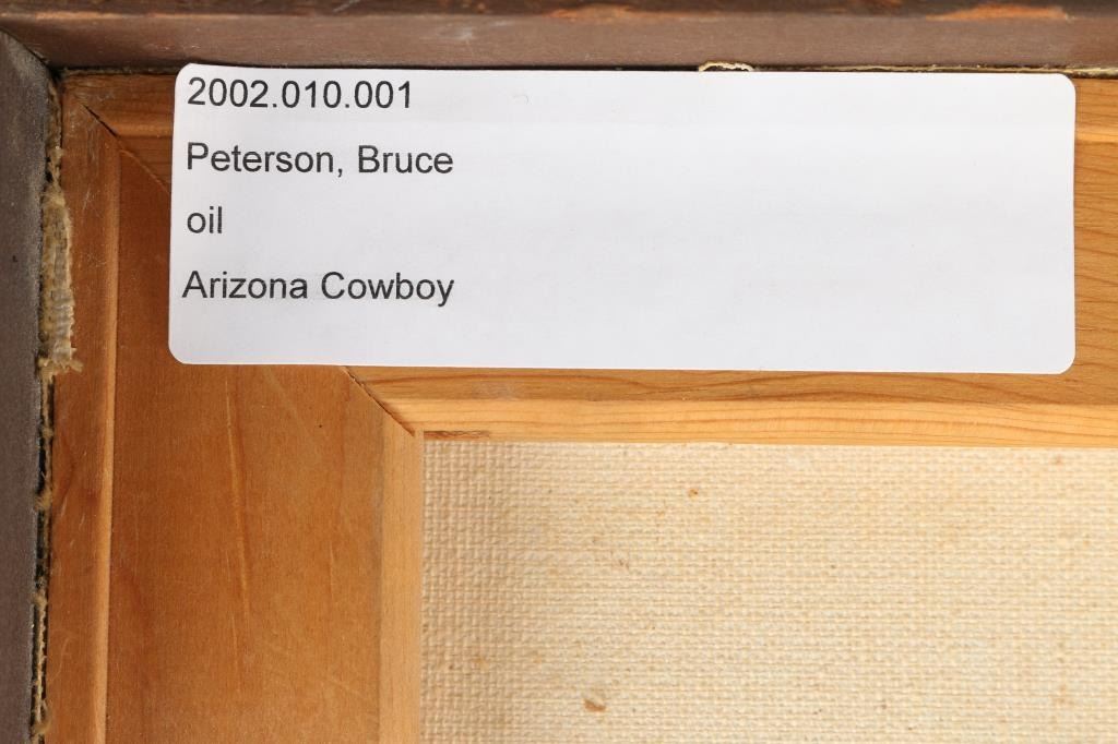 By Bruce Peterson, titled "Arizona Cowboy". Measures 41" x 31", framed. De-accessioned from The Phippen Art Museum.