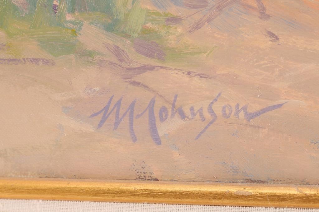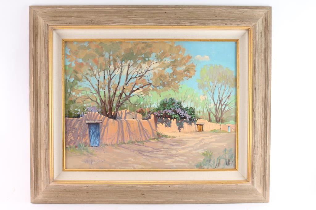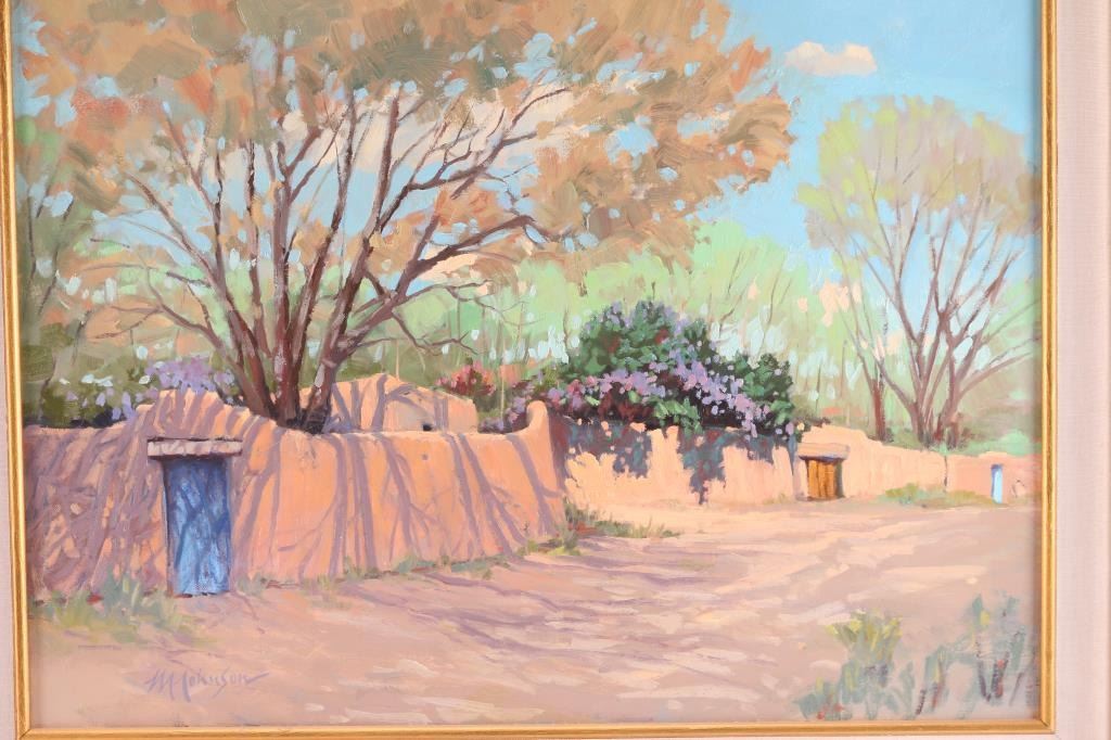 By Michael Johnson, titled "Lilacs and Adobe". Measures 27 1/4" x 33". De-accessioned by The George Phippen Art Museum.