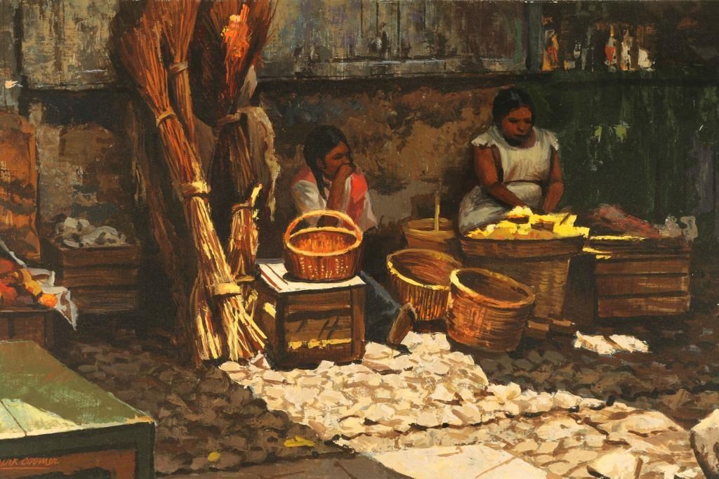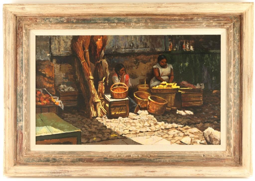 "Las Escobas', Arizona artist known as the painter of light. HIs paintings are known for his interpretation of Spain, Mexico, Venice and Portugal. Very popular in the 50s and 60s. Image size 28 1/2" x 19 1/2" hand signed lower left.