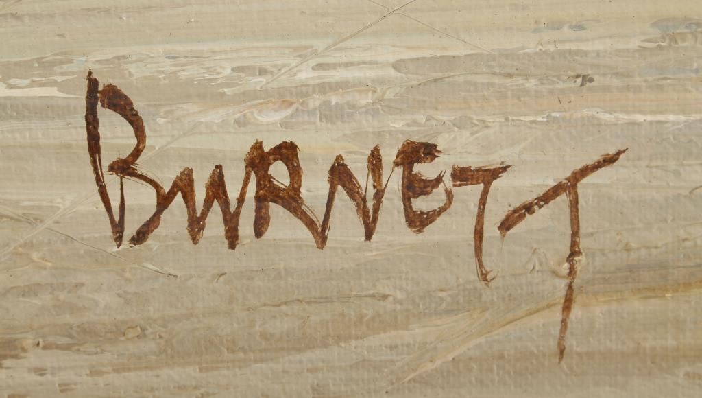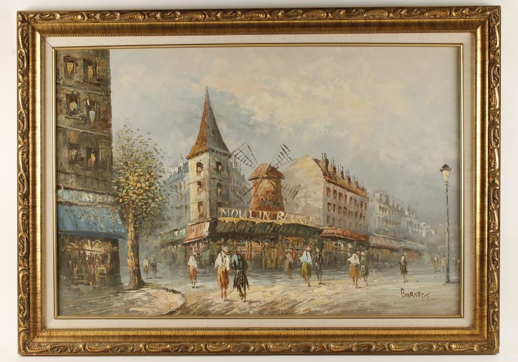 by Burnett signed lower right hand corner. Depicting France and the " Moulin Rouge". In gold gilt frame, image size is 36"X23".