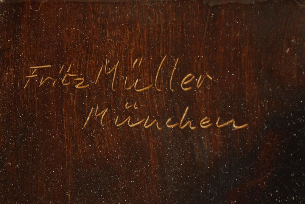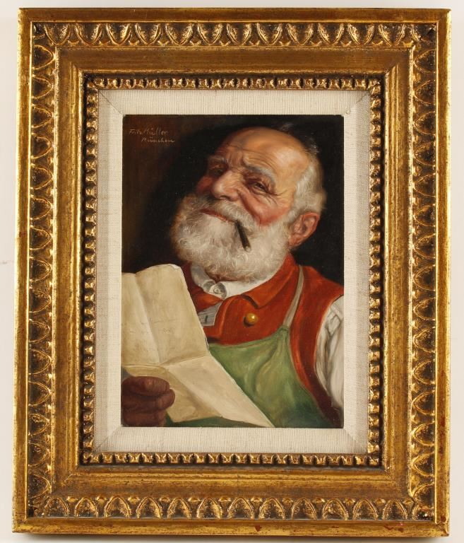 by noted German artist Fritz Muller, signed upper right hand corner. Depicting a German gentleman smoking a cigar reading a paper. image size is 9X6.5. Born 1897. In gold frame. From the estate of John Knoblauch noted Western art collector.