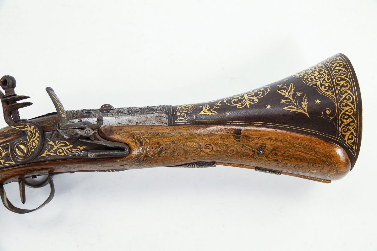 Original Ottoman Flintlock "Pirate" Blunderbuss made famous by the French pirate Robert Surcouf as his weapon of choice. This is a functional firearm (shooting not recommended - consult with a professional) with intricate hammered brass wire inlay and gold leaf designs. There is a crack in the tang but it is a beautiful piece of European history. MFG 1790-1830 C&R Eligible S/N: nsn