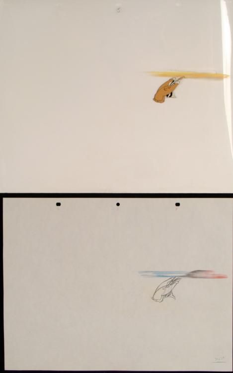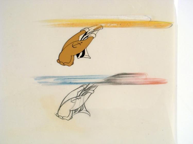 Even though there is no absolute sense of continuity in the stories, certain plot and presentation elements remain mostly constant, including purposeful contradictions in Popeye's capabilities. Though at times he seems bereft of manners or uneducated, * Popeye is often depicted as capable of coming up with solutions to problems that (to the police, or, most importantly, the scientific community) seem insurmountable. Popeye has, alternatively, displayed Sherlock Holmes-like investigative prowess (determining * for instance that his beloved Olive was abducted by estimating the depth of the villains' footprints in the sand), scientific ingenuity (as his construction, within a few hours, of a "spinach-drive" spaceship), or oversimplified (yet successful) diplomatic * argumentation (by presenting to diplomatic conferences his own existence --- and superhuman strength --- as the only true guarantee of world peace). Popeye's pipe also proves to be highly versatile. Among other things, it has served as a cutting torch, jet * engine, propeller, periscope, and, of course, a whistle with which he produces his trademark toot. Popeye also on occasion eats spinach through his pipe, sometimes sucking in the can itself along with the contents. * * * * * **The cel and drawing are from the 1950's Popeye television show series. * * * * Popeye is just out of control... * * * Original Production Animated Cel and Drawing Original "rough" animation drawing, in black, blue, and red, with notations in black. * Overall Size of Drawing: 11 3/4" x 15 1/2" Overall Size of Cel: 13" x 15 3/4" Excellent Condition * This is an original hand-painted cel set-up used in the production of an episode of "Popeye." Each one-of-a-kind set-up represents a slight change in position of the characters. When individually photographed and projected in rapid succession, the images * appear to move. * * To create production cels, the original animator's drawing is transferred onto an acetate cel (by hand-inking and/or photo copying). The cel is then hand-painted on the reverse side. * * * The cel and drawing are ready to be matted and framed. The animator's notations are at the top of the cel and top and bottom of the drawing. * * *