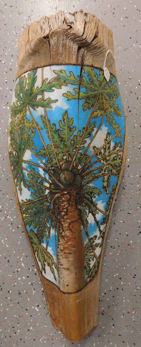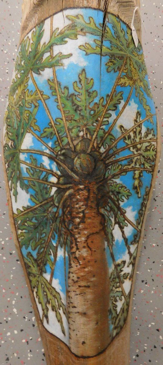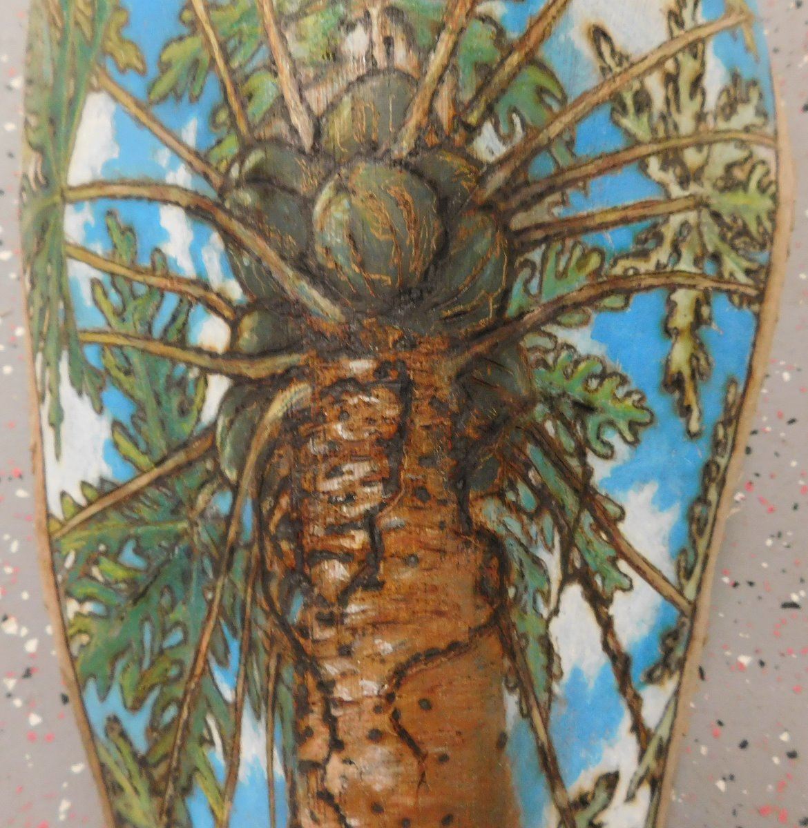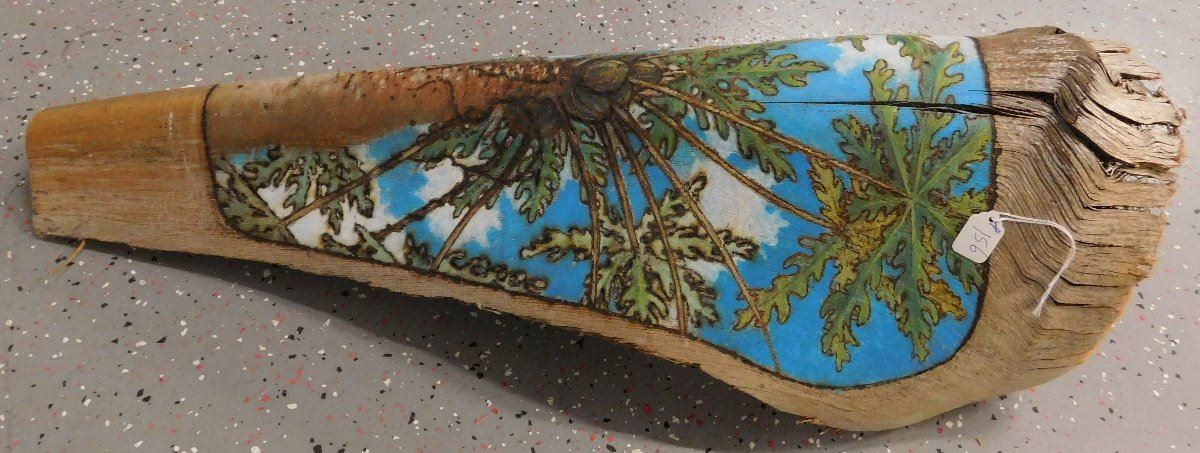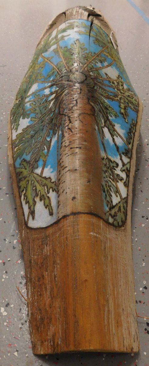 Original Painted Palm Branch, 2016. Made of palm, the item measures 29" x 13" x 11". Steve Aho. Fancy painting and burn design, very neat. Condition: Very good, see images. Shipping: $45.00, USA estimate only, due to length.