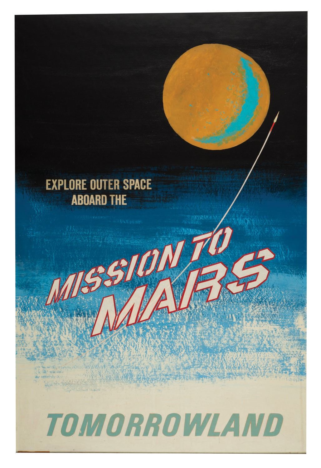(Disneyland/Walt Disney World, c.1975) An extremely rare one-of-a-kind original painting for a Mission to Mars poster. With the introduction of Mission to Mars in 1975, a new poster was required. Accomplished by an unknown artist, the concept artwork features elements adapted from Ken Chapman's earlier Flight to the Moon poster. This developmental artwork is particularly notable, as the Omnibus advertisement sign was the only in-Park poster artwork that was ever produced for the Tomorrowland attraction. The painting is on masonite, has an image size of 35.5"x53.5", and is mounted within a 38.5"x56.5" frame. The painting is in fine condition, with some slight paint chipping primarily to the corners of letters in "Tomorrowland," and an approximately 2" scratch across the H in "THE."