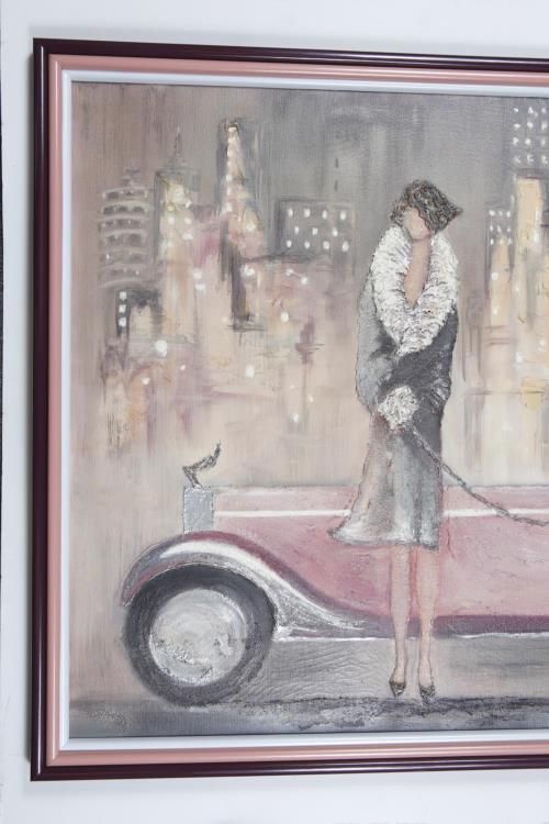 We have for sale a signed Original Women Walking Dog on Street with Car Painting. This Art Deco painting was purchased from an estate. We believe this mixed media painting consists of acrylic paint and some kind of thickening agent to create 3 dimensional textures, as seen in the photos. The Frame Size is 33" x 51" and the Image Size: 31" x 48". This original work of art is signed by an artist, but we have not been able to determine the creator after researching the signature. This gorgeous piece of Art Deco history will make a great addition to any collection.