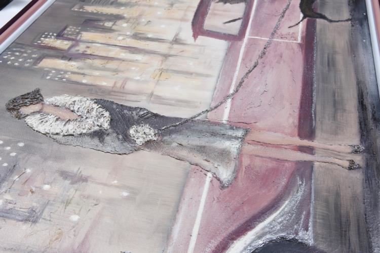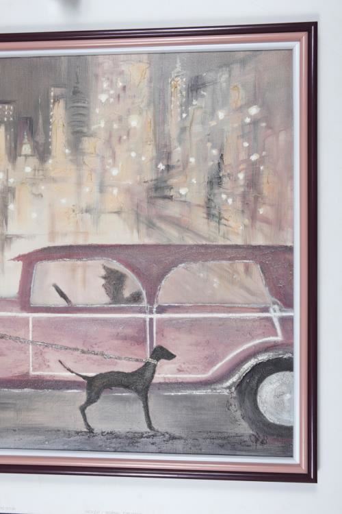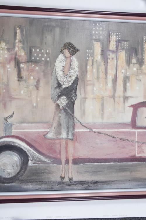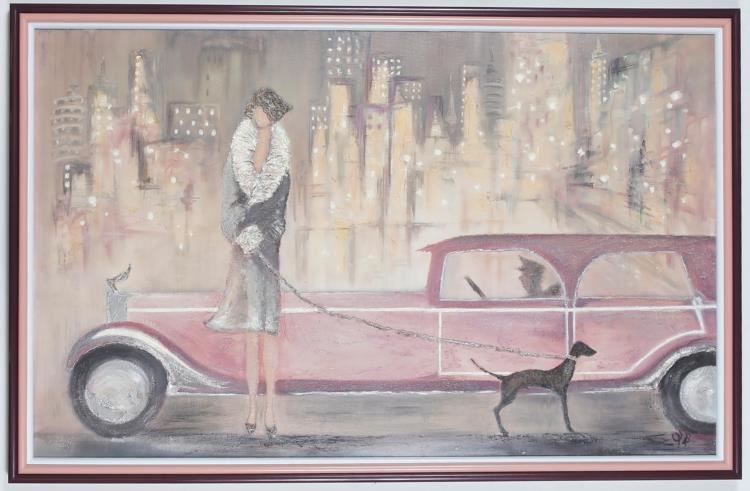 We have for sale a signed Original Women Walking Dog on Street with Car Painting. This Art Deco painting was purchased from an estate. We believe this mixed media painting consists of acrylic paint and some kind of thickening agent to create 3 dimensional textures, as seen in the photos. The Frame Size is 33" x 51" and the Image Size: 31" x 48". This original work of art is signed by an artist, but we have not been able to determine the creator after researching the signature. This gorgeous piece of Art Deco history will make a great addition to any collection.
