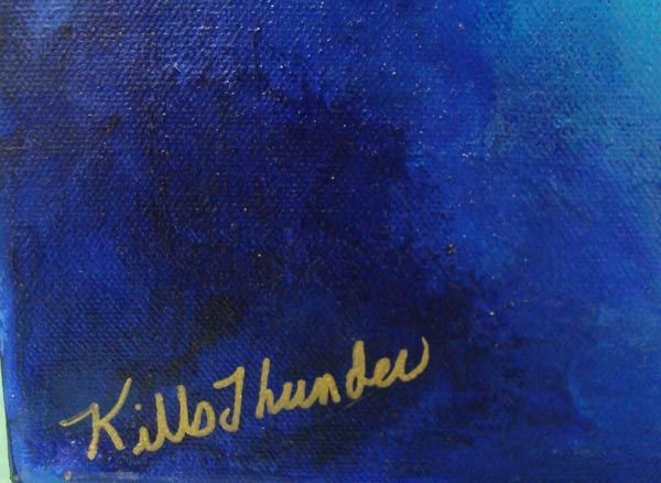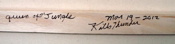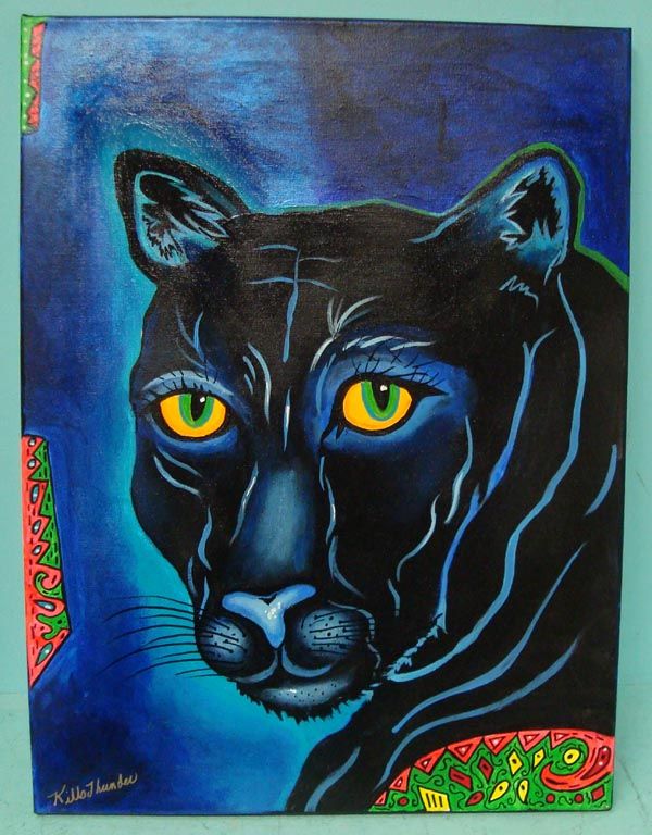 Original Acrylic on Canvas Painting-Kills Thunder. ''Queen of the Jungle'' Black Panther with golden eyes stares at the viewer. 24''H x 18''W. Signed and dated by artist on frame and front. Painted with the vibrant colors typical of Kills Thunder.