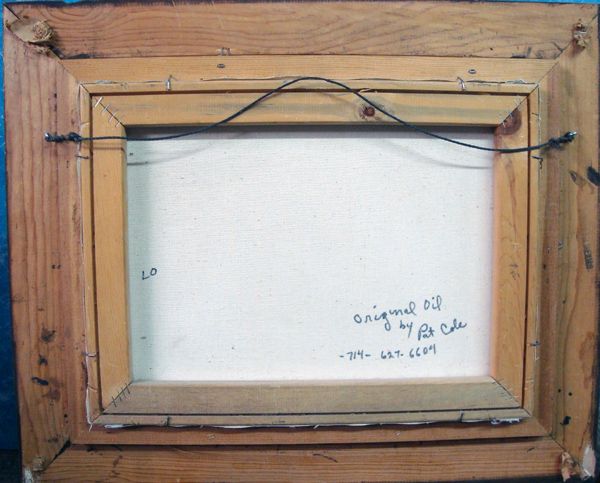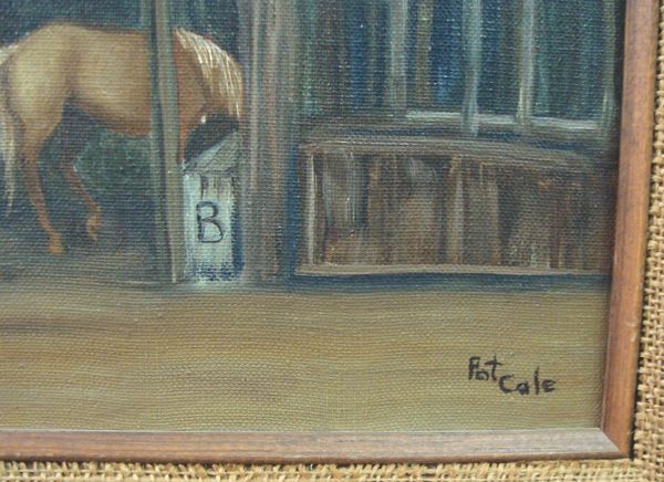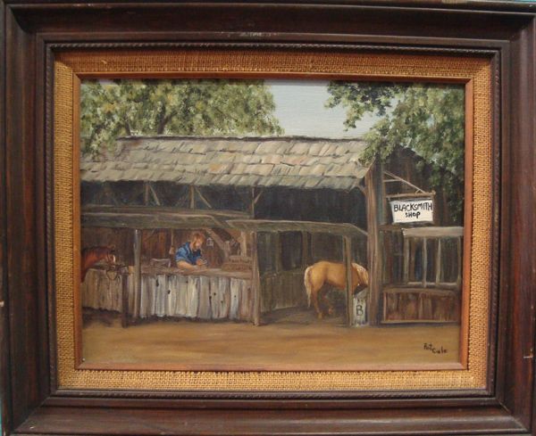 Original Acrylic ''Blacksmith Shop'' by Pat Cole, framed and matted, signed in lower righthand corner Pat Cole, wooden frame with burlap style mat, scene depicts blacksmith at work in shop and two horses, visual measures 11.5'' x 15.75'', subtle earthtones
