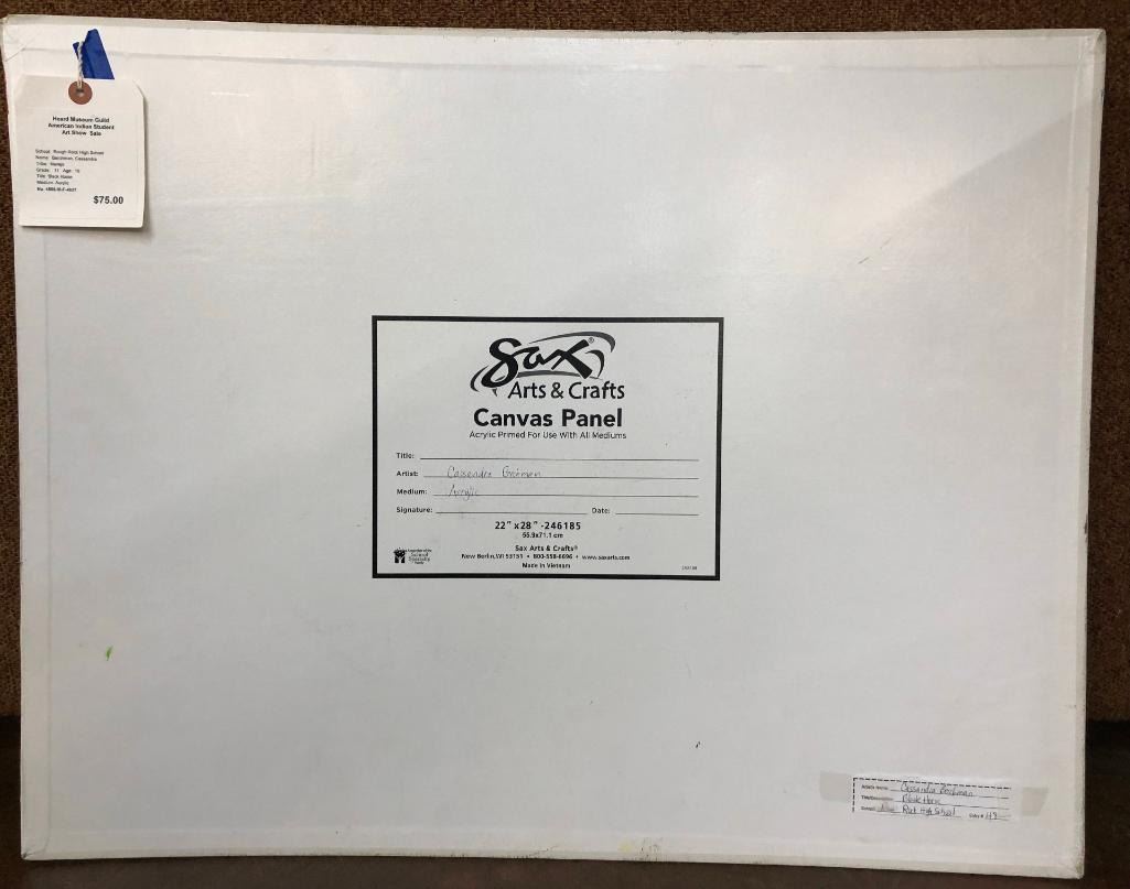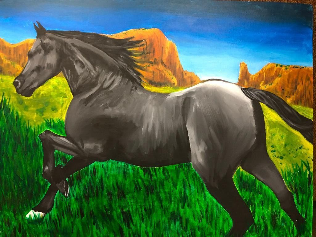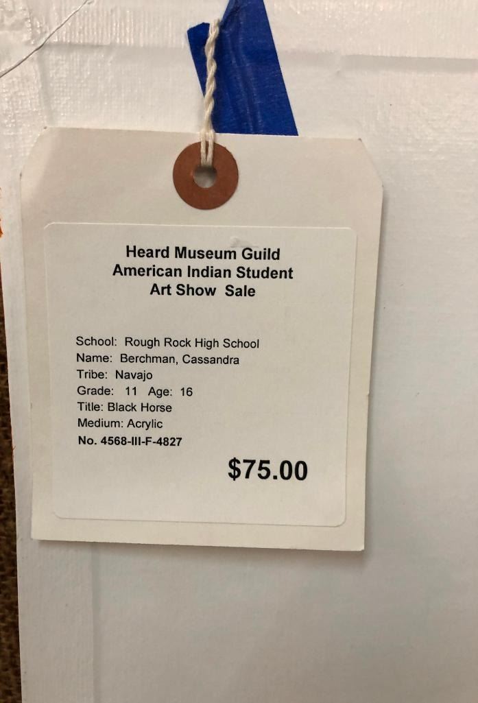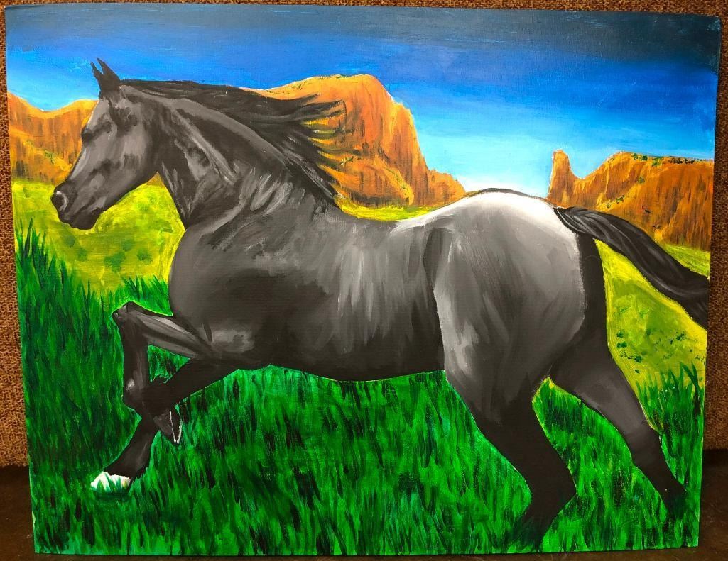 Offered for sale in this lot is a original painting by Cassandra Berchman. This painting, title Black Horse, was featured in the Herd Museum Guild American Indian Student Art Show Sale. It is believed the artist was about 12 when this was painted. Maker: Cassandra Berchman, Navajo. Approx. Age: Fairly modern Size: 28 inches wide X 22 inches long. Condition: Good for its age, normal wear expected. Please look closely at the pictures - they are an important part of our description. Shipping: There will be a $10 handling / packaging fee for shipping this lot. The actual cost of postage will be added on top of that. BUY IT NOW: If you would like to buy this item now without waiting for the auction to end (this option is only available up to 48 hours before the auction starts to close), the “Buy it Now” price is the high estimate of this lot. If you would like to end the auction early and pay the high estimate (plus applicable fees), please contact us by phone or email and reference this lot number.