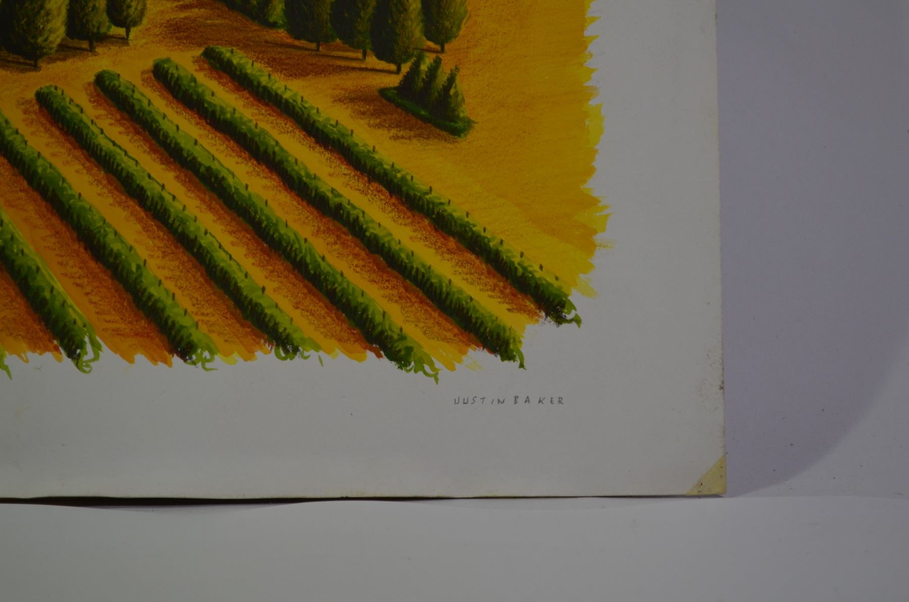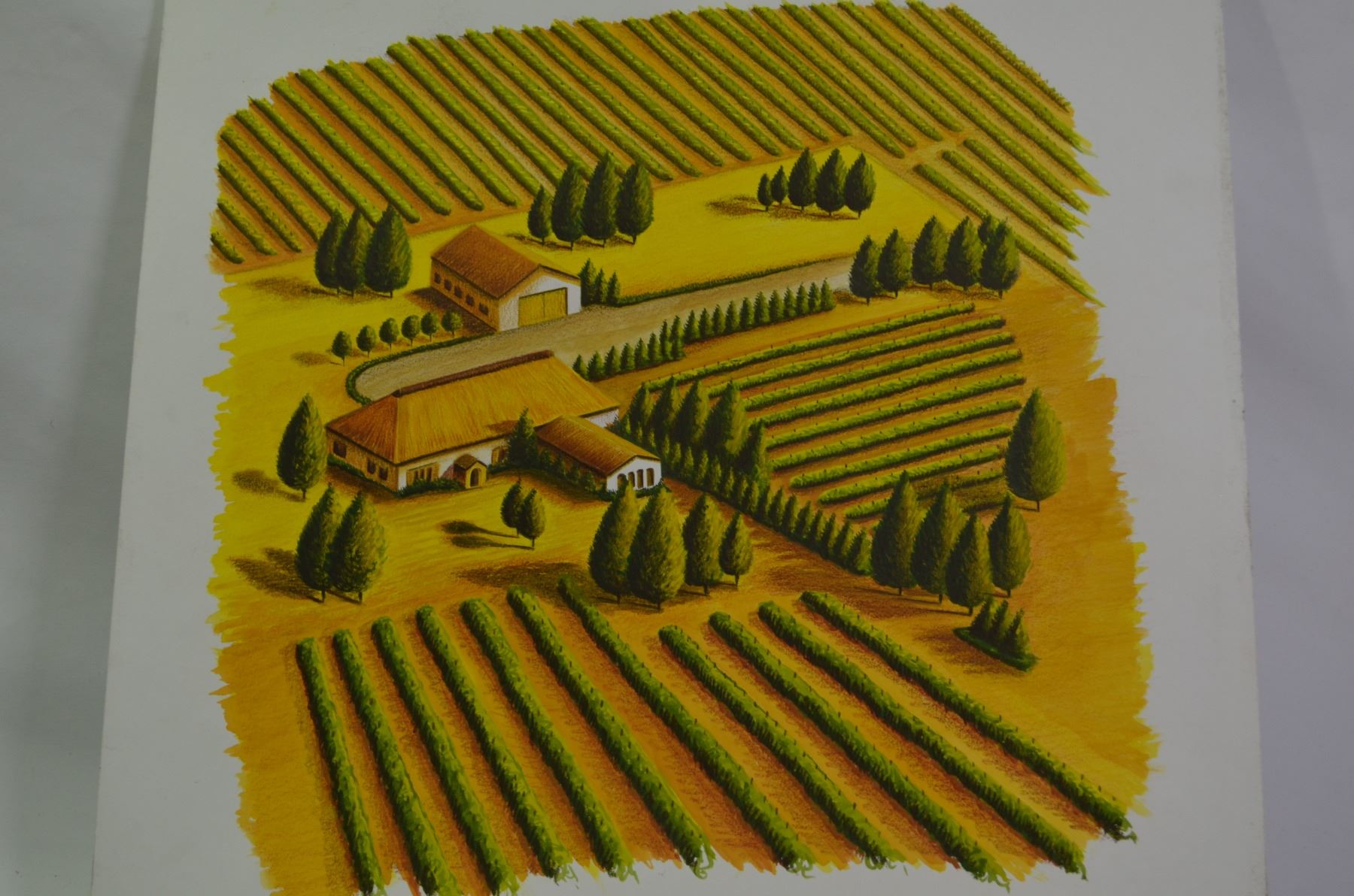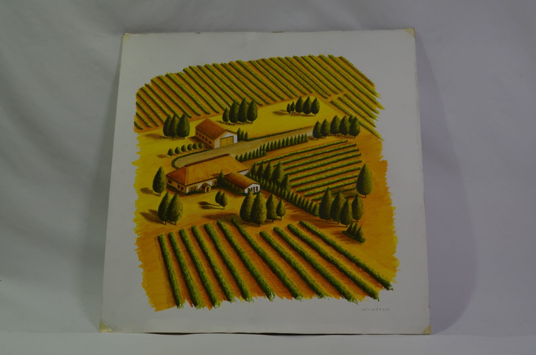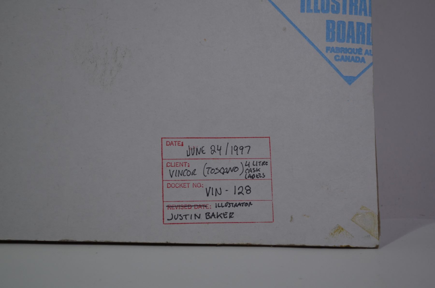 Original art for a wine label. Some damage to corners and edges. Measures 21 x 21".