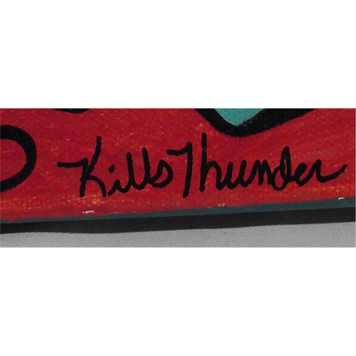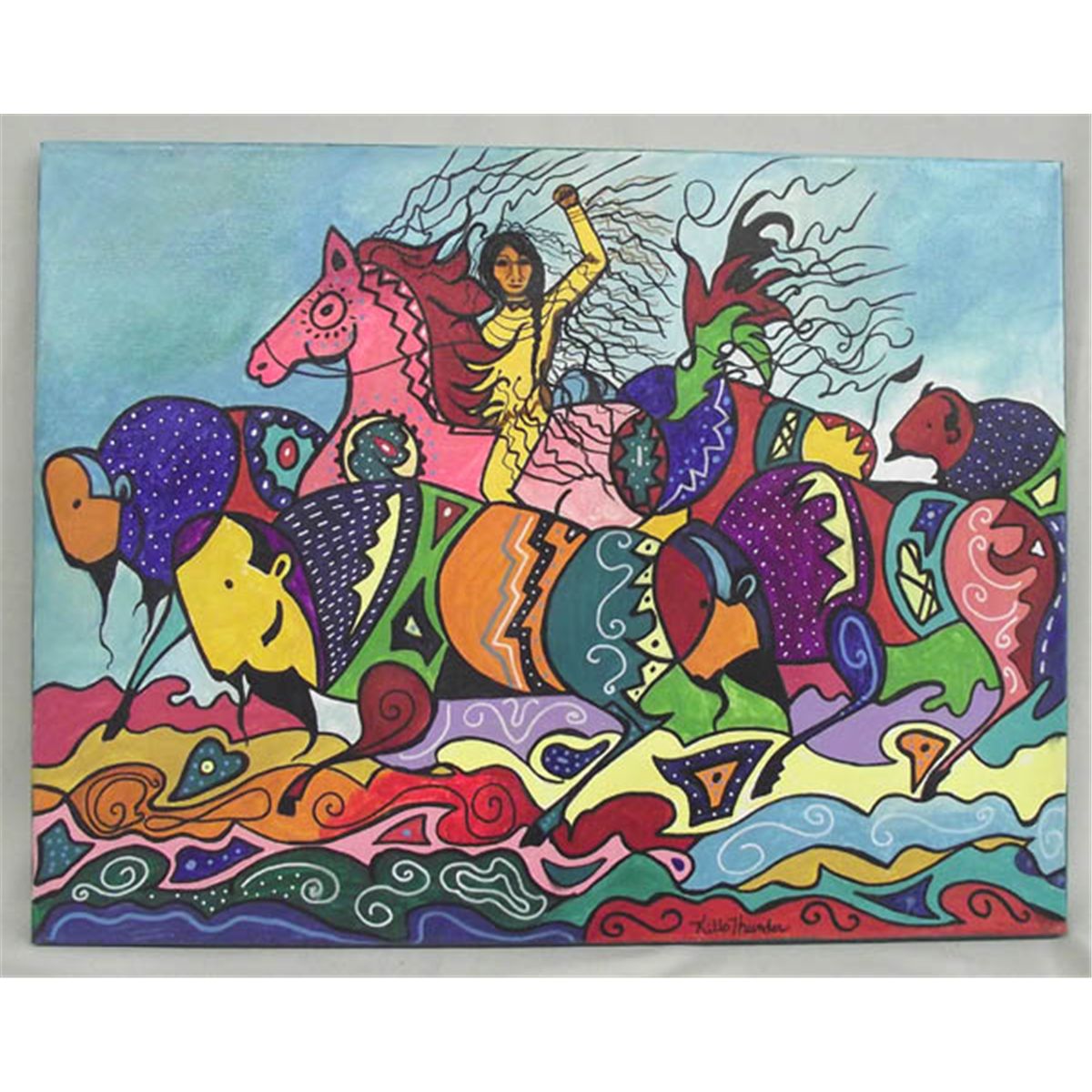 Original art by artist Kills Thunder- untitled. 24''x18''H. Topic is Native American Hunter of Bison. In artist's traditional bright colors. Acrylic on canvas. Buyers Pay Actual Shipping and Handling Charges(see terms and conditions for more information)