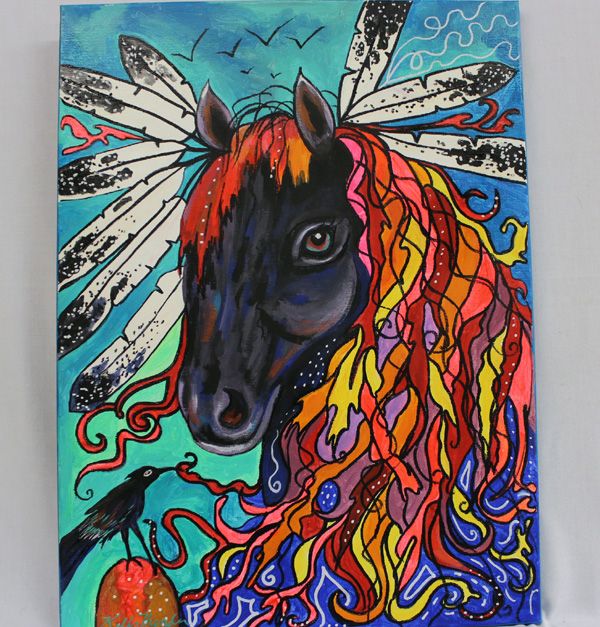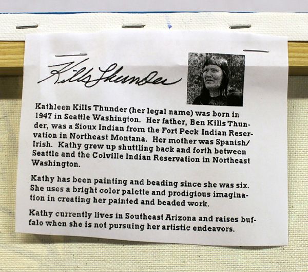 Original Painting by Kills Thunder. This beautiful Piece is titled ''Work Horse'' and measures approx. 24''H x 18''W. Informational piece about the artist attached to back. Kathleen Kills Thunder was born in Seattle Washington and lives in Southwest Arizona. She has been painting and beading since she was six and uses bright colors and a prodigious imagination in creating her work.
