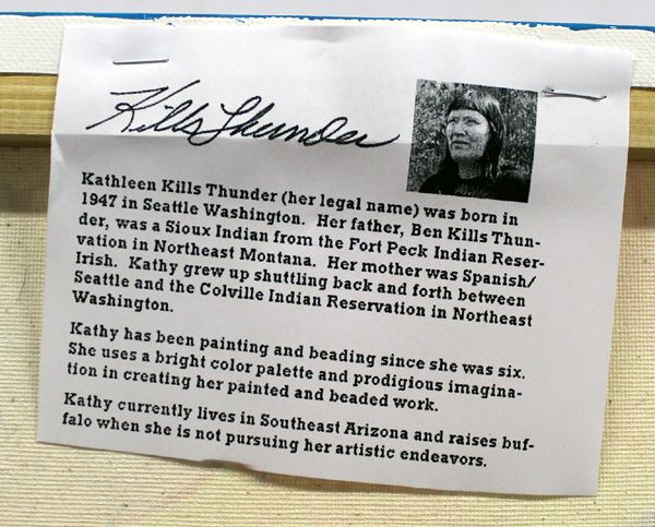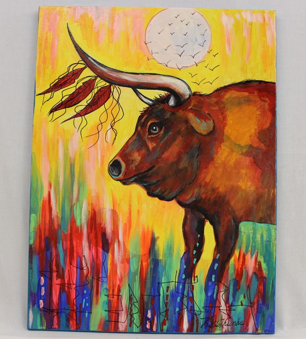 Original Painting by Kills Thunder. This beautiful Piece is titled ''Red Bull Journey Home'' and measures approx. 24''H x 18''W. Informationl piece about the artist attached to back. Kathleen Kills Thunder was born in Seattle Washington and lives in Southwest Arizona. She has been painting and beading since she was six and uses bright colors and a prodigious imagination in creating her work.