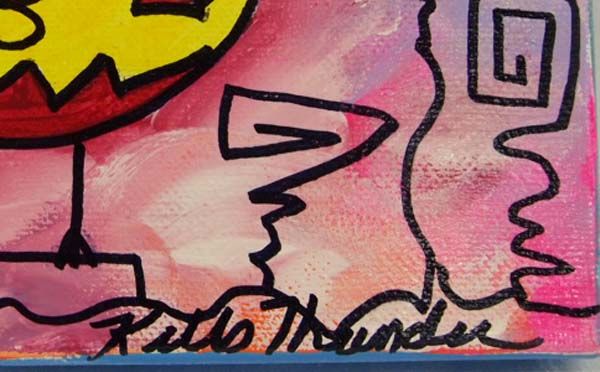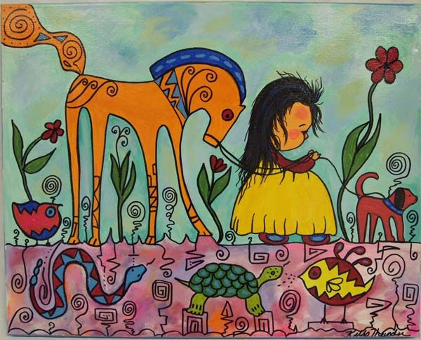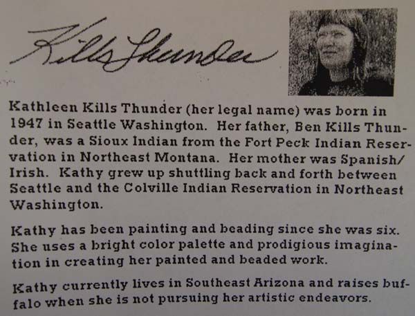 Original Painting by Kills Thunder titled ''Friends'', measures approx. 16''x 20''. Artist Bio: Kathleen Kills Thunder was born in Seattle, Washington. Kathy has been painting and beading since she was six. She uses bright color palette and prodigious imagination in creating her painted and beaded work. Kathy currently lives in Southeast Arizona and raises buffalo when she is not pursuing her artistic endeavors.