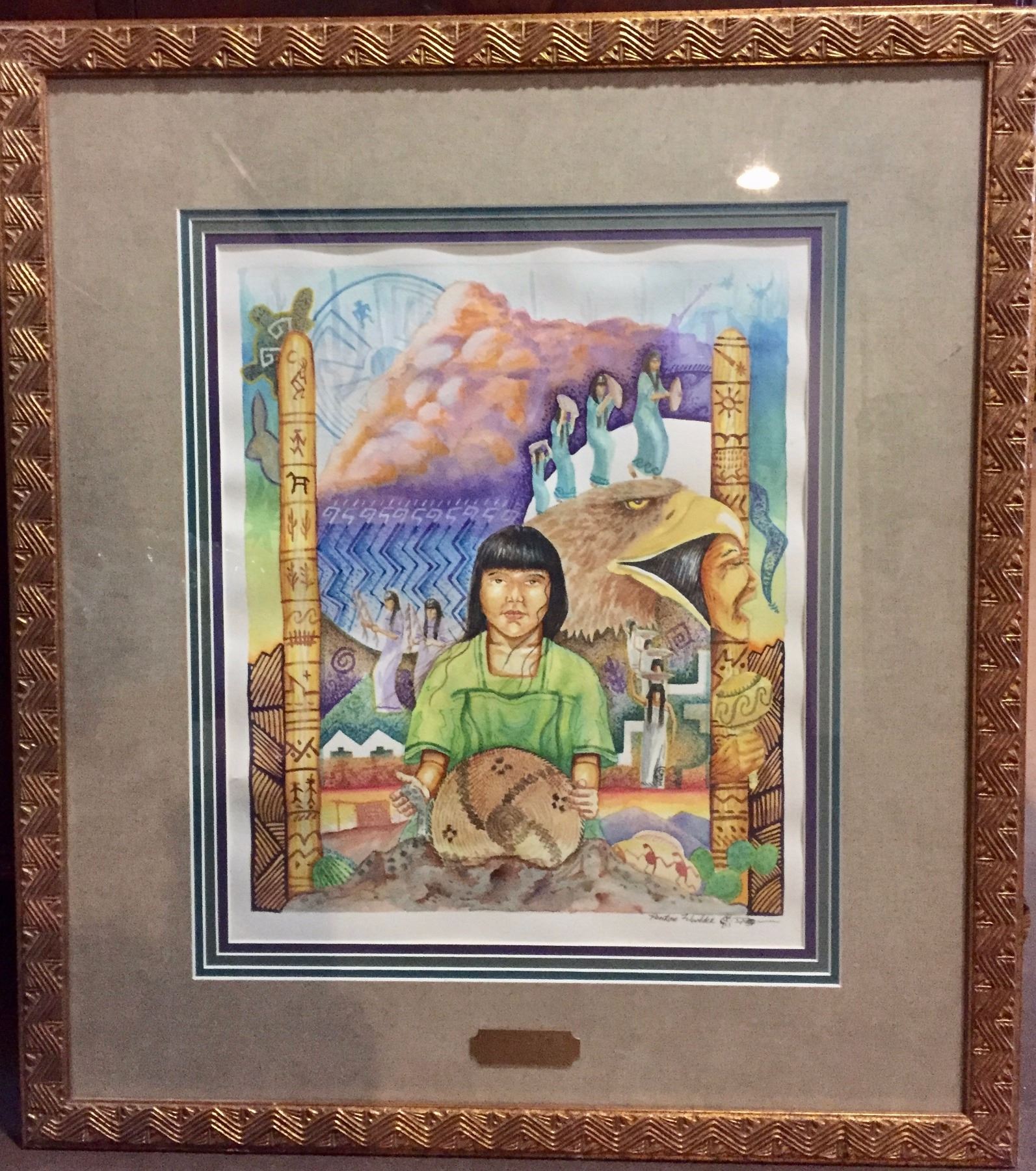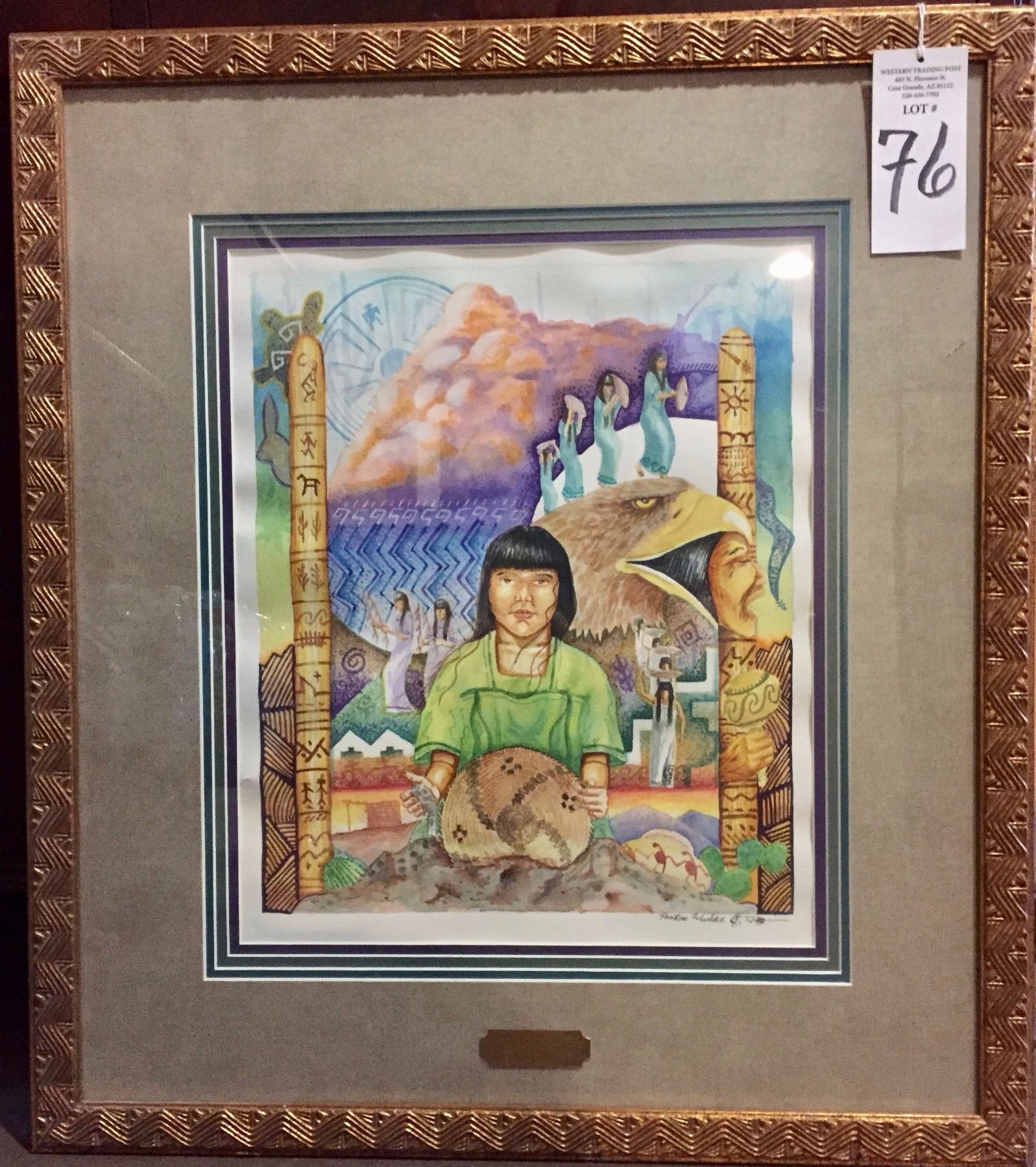 Description: This is THE original artwork for one of the, O’Odham Tash ‘Indian Days’. This is the original painting that all posters and programs would have been copied from. It is a one-of-a-kind original. Maker: Penrose Fulwilder, Pima. Approx. Age: Circa late 1990s. Size: 22 5/8” across x 26” long, frame included. Condition: Good for its age, normal wear expected (does have a chip on the frame, but not visible from the front). Please look closely at the pictures - they are an important part of our description. Shipping: There will be a $10 handling / packaging fee for shipping this lot. The actual cost of postage will be added on top of that.