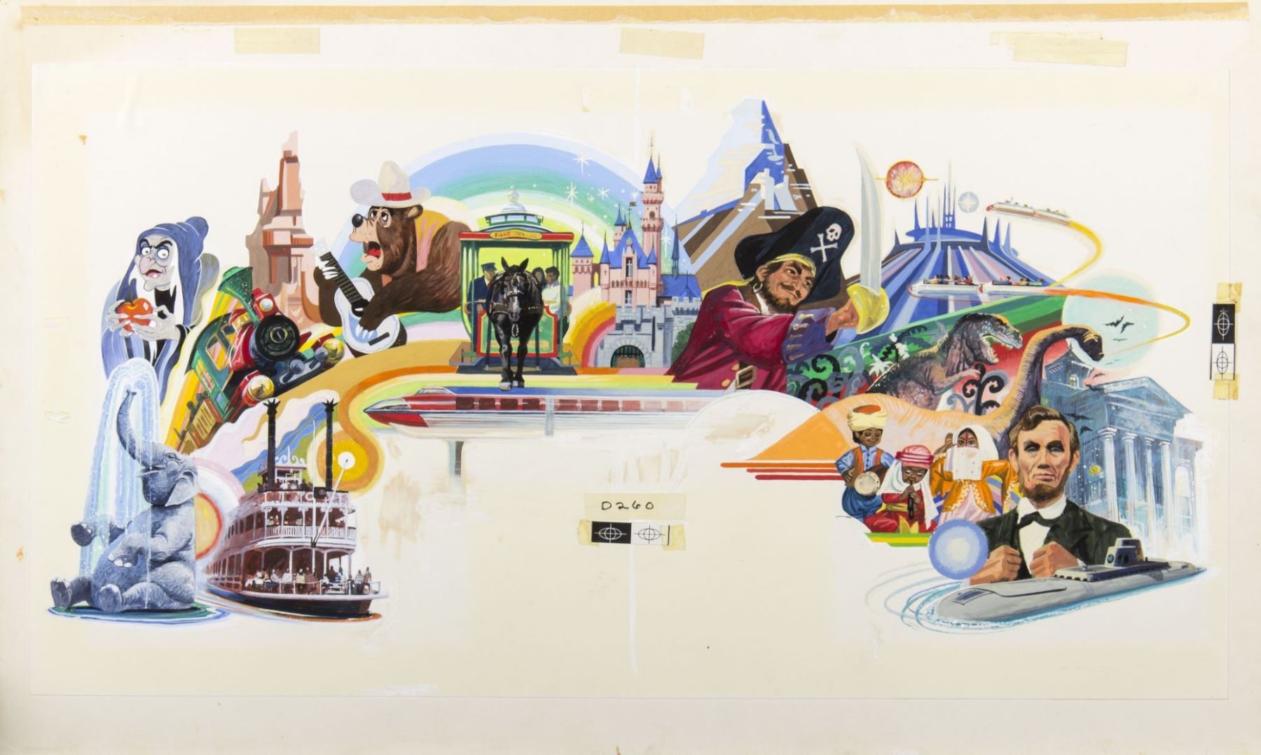 (Disneyland, 1970s) An original painting featuring numerous attractions and iconic elements of Disneyland seen throughout the park's first few decades. This painting was likely created for a Disneyland magazine or book. Some of the attractions depicted include "Snow White's Scary Adventures", "Pirates of the Caribbean", "Space Mountain", "Great Moment with Mr. Lincoln", "Primeval World", and many more. The painting is accomplished in acrylic on paper that is mounted to artists' board. The board measures 15"x25" and the artwork is in very good condition, with some adhesive residue along the top of the board and some wear to the left-side of the paper.