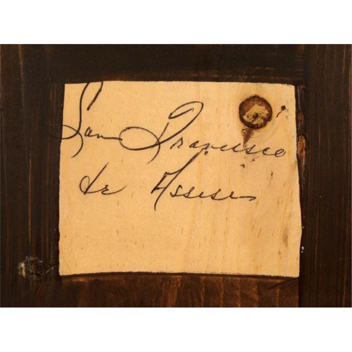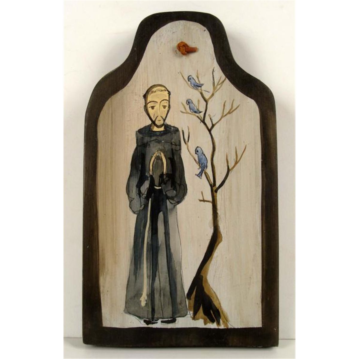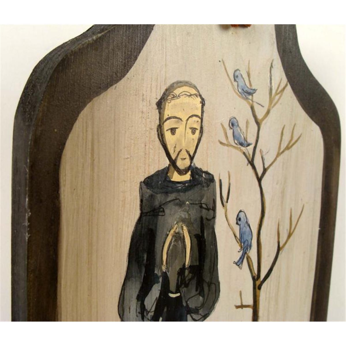 This is an original painting on board of Saint Francis of Assisi. He is known as the patron saint of animals, and he is portrayed here praying next to a tree with three bluebirds. The board measures 5 1/4" x 9 1/2". The back is labeled. It is in very good condition, and appears to be quite old. * This is a unique piece of original art of the well loved saint.