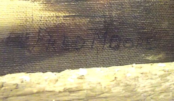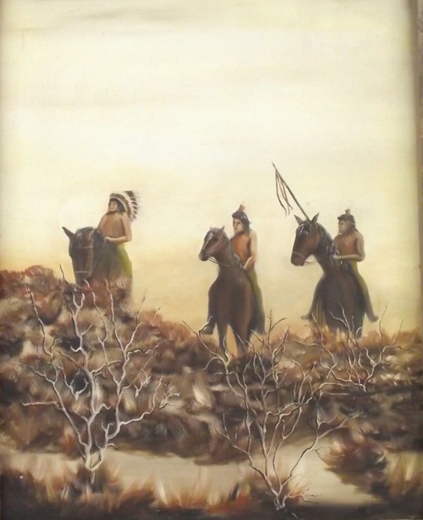 Original Painting on Canvas - Fred Moore. The theme is Native American. The frame is heavy, rustic rough wood and ready for hanging. A single nail is on the top of the frame. Painting is 29''H x 23''W without frame.