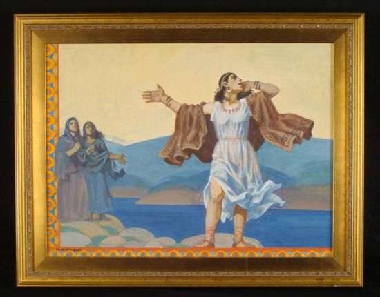 This is an original painting of several figures in a mountainous setting. It is nicely done, by an artist that we do not recognize. The work is signed on front. The scene appears to be from ancient times, and it is possibly religious themed. Artist: Unknown Title: Unknown Medium: Water based paint on paper Signature: By the artist in black marker, lower left Image size: 19 x 21 3/4 inches Frame size: 21 3/4 x 26 1/2 inches Framing: Custom framed, in gold painted wood frame, no glass Condition: Excellent; frame has a chip on the lower right corner This is a nice piece for anyone who appreciates original paintings. *