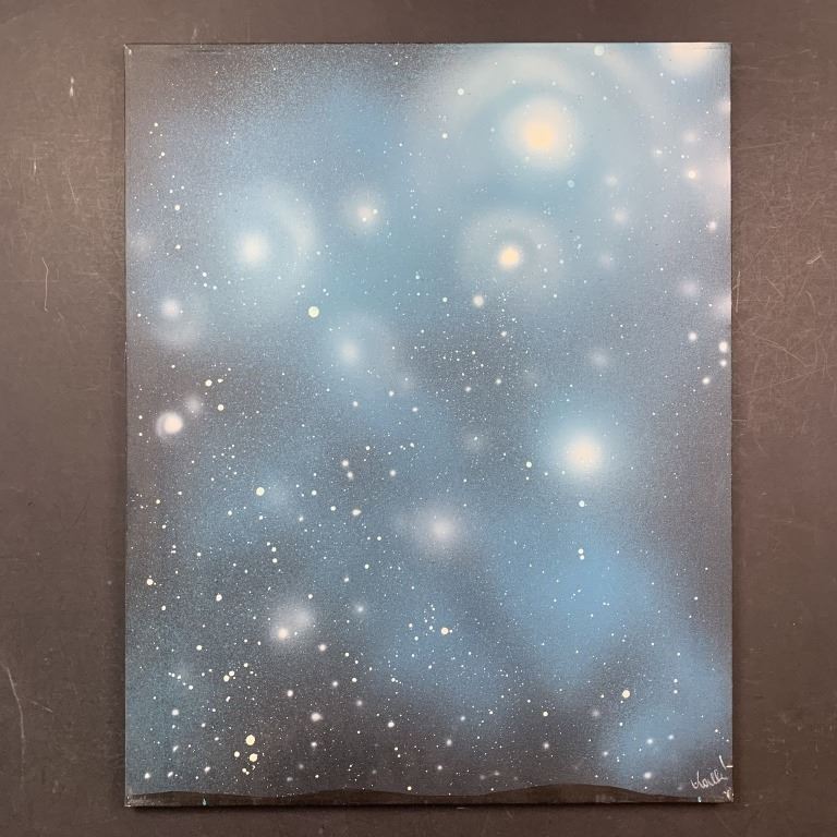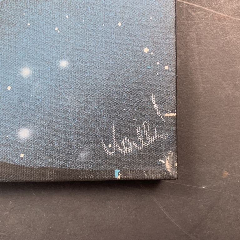 Original Painting on Canvas. Stars shine brightly over the darkened ground. This piece is signed in the lower right and is in excellent condition.