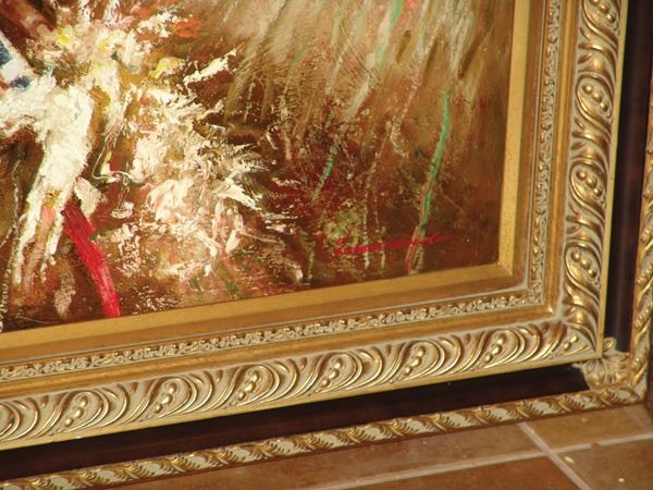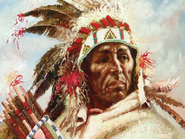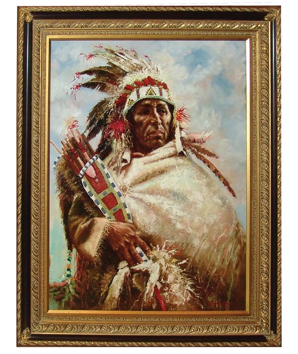Huge, signed original oil on canvas showing a proud, Plains chief. Very good condition, in custom carved, gilded gold frame.Late 1900s40" x 30" (51" x 41")