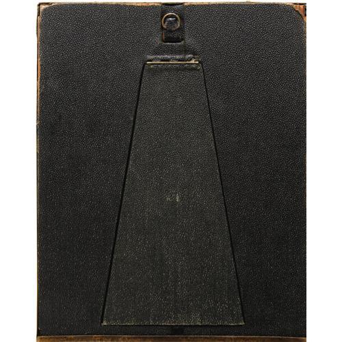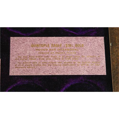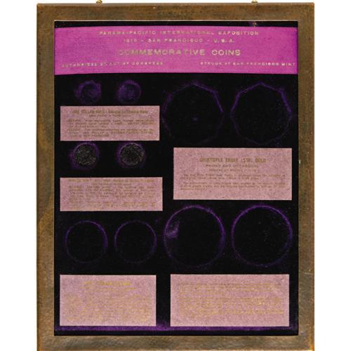 <B>Original Panama-Pacific Double Set Frame.</B></I> Perhaps the second most ornate packaging for a set of United States commemorative coins, after the 32-slot cherrywood caddy crafted for the 1995-1996 Olympic issues. The copper frames, which supplemented existing leatherette-and-velvet holders, were created by Shreve & Co., a noted San Francisco jeweler that operates under that name to this day. While the copper frames for the five-coin and ten-coin sets are identical, the interiors are different, and the former is far more common than the latter.<BR> The frame, glass, and interior labels are in Excellent condition. At the top, the left screw protrudes slightly, and the interior velvet is frayed in a spot at the upper right, revealing the surface beneath. Minor crushing of the velvet is visible in the quarter eagle slots as well. On the back, the leatherette is worn at the edges, most notably at the upper corners, though this is minor in context, and the prop and ring are intact. This is a great opportunity to acquire an important numismatic artifact.<BR><BR><b>Shipping:</b> Coin/Currency (<a target="_blank" href="http://www.heritageauctions.com/common/shipping.php">view shipping information</a>)