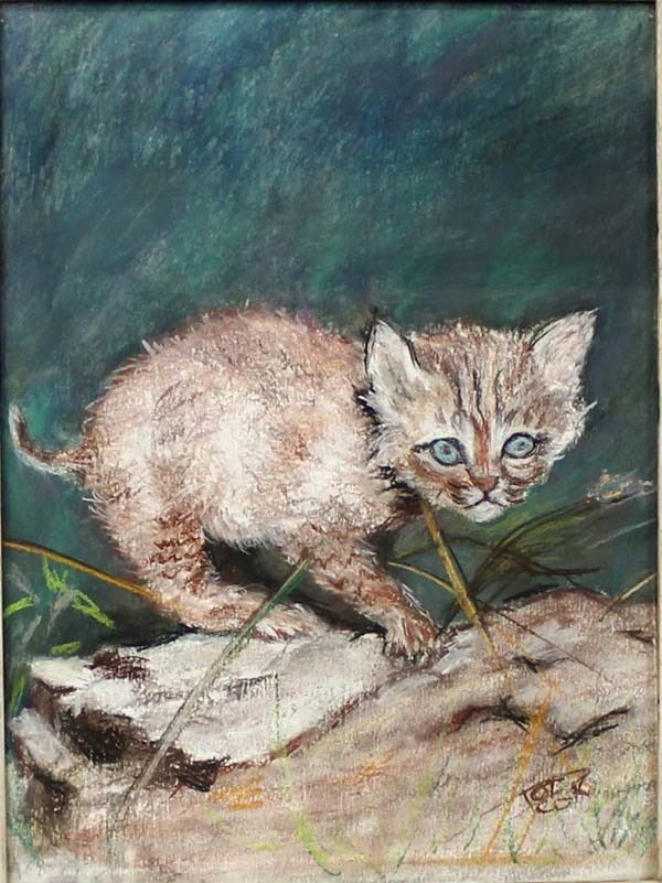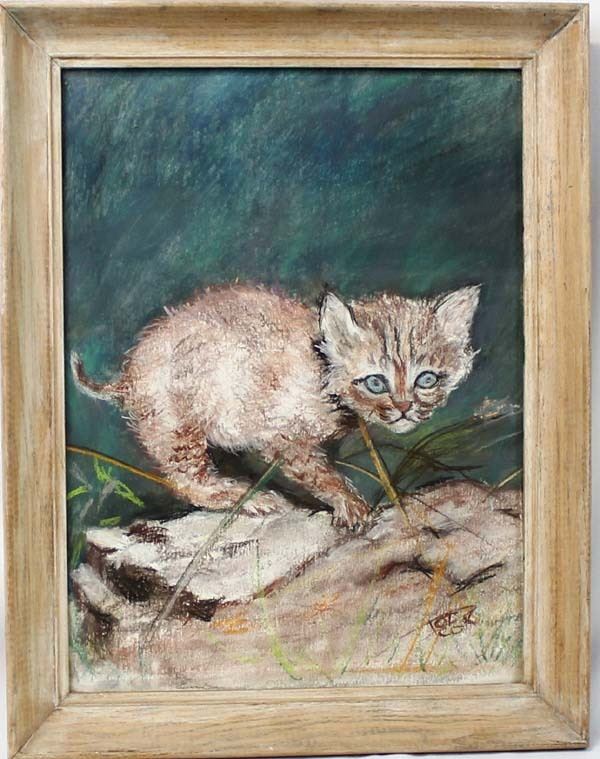 Original Pastel Bobcat Kitten Picture, visual measures 11.5'' x 15'', overall framed measurement of 14.5'' x 18.75'', signed by the artist, appears to be Todd Cox