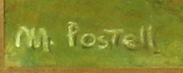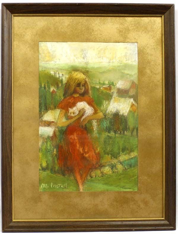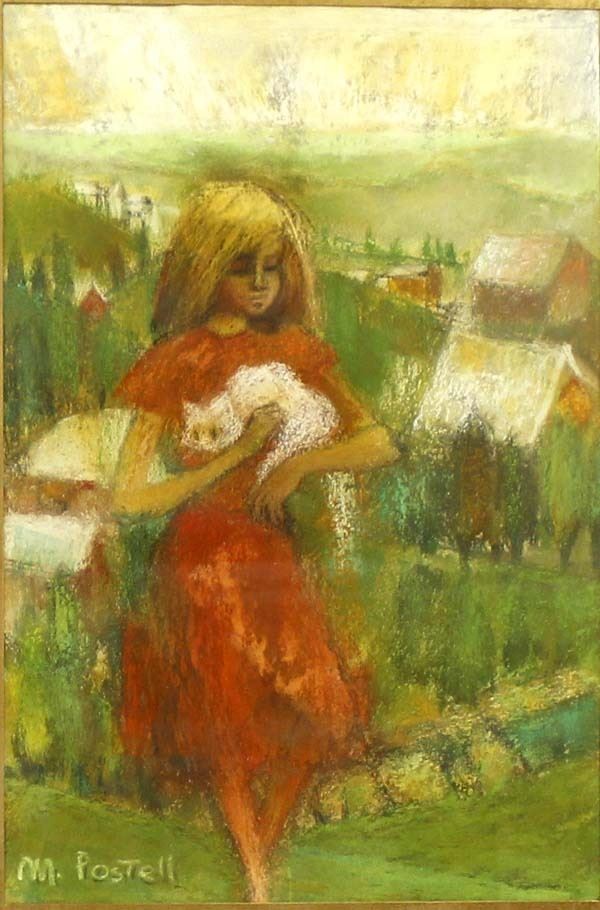 Original Pastel Chalk Picture by M. Postell, framed, matted, and under glass, visual measures 11.5'' x 17'', signed by the artist, depicts village scene of young girl holding white cat,
