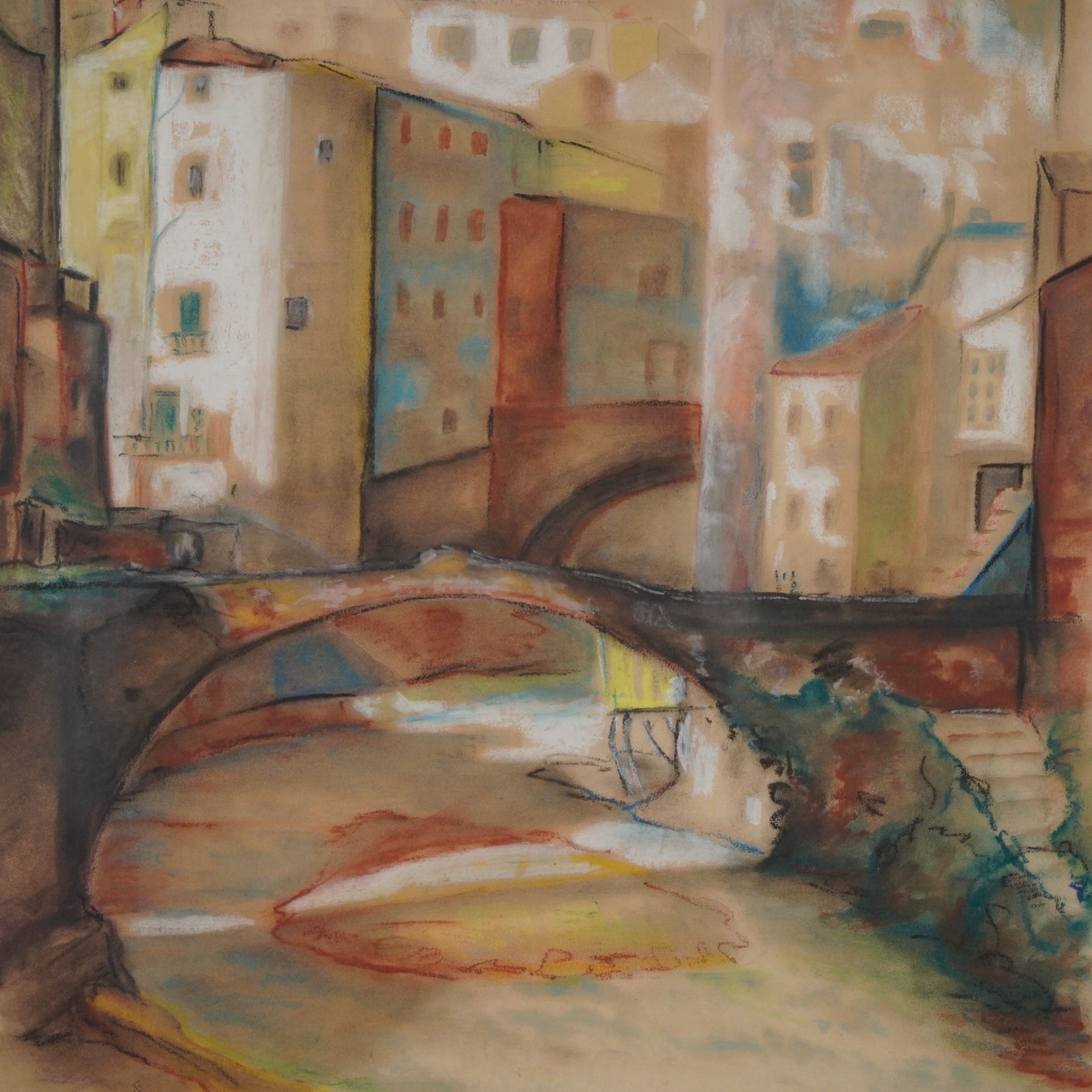 Original Pastel on paper, Cityscape with Bridge, Signed