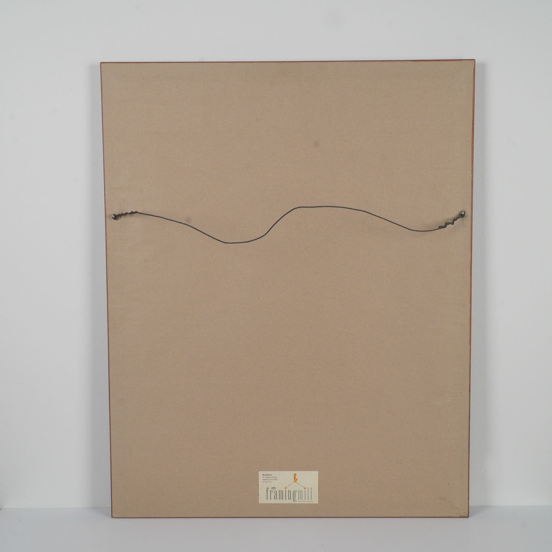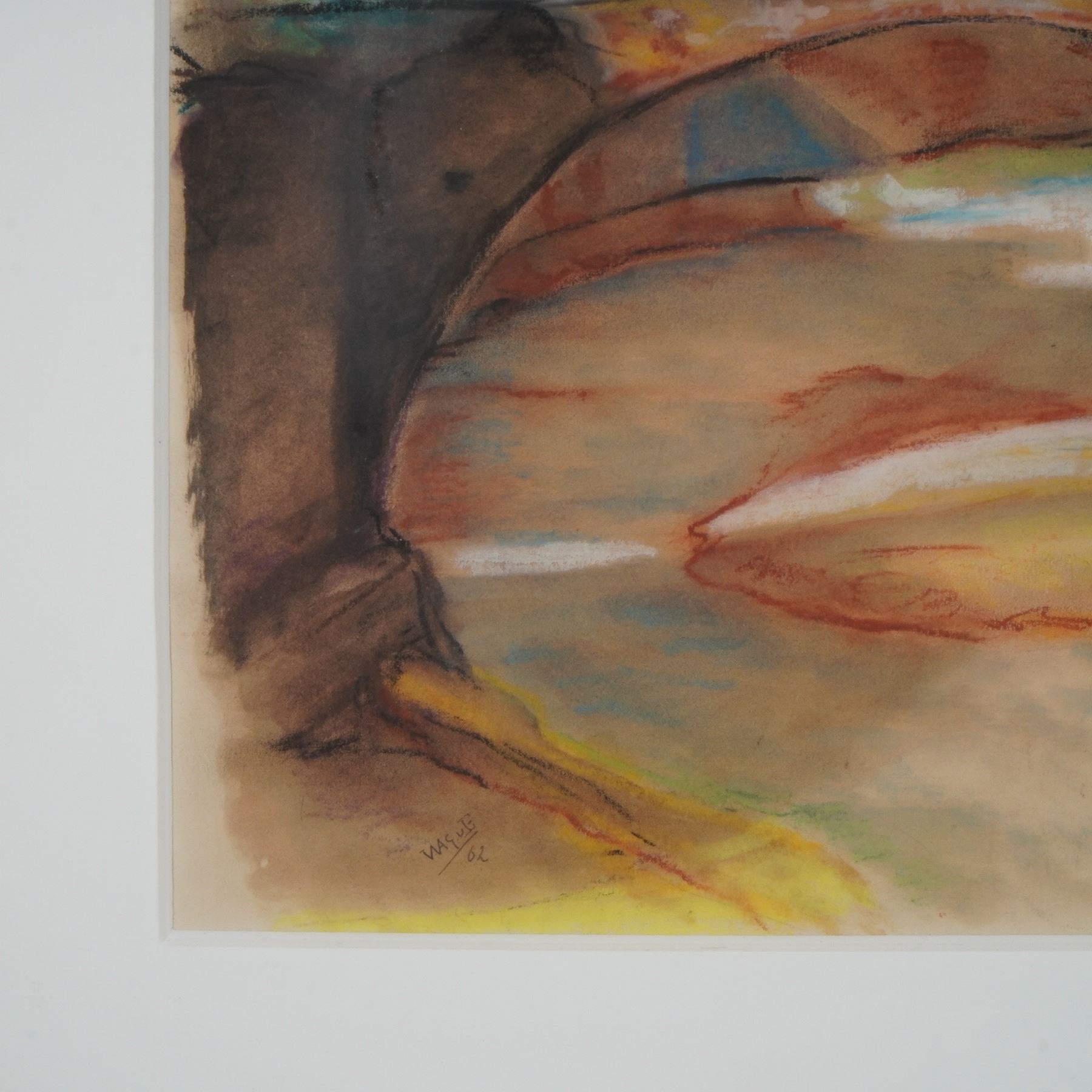 Colorful pastel on paper made in an expressive style, featuring layered buildings and multiple arched bridges over a shallow river, rendered in a warm palette of ochres, reds, blues, and earth tones. The stylized architectural forms and vivid highlights reflect a mid-century modernist sensibility. The work is matted and presented under glass in a black and gold-toned contemporary frame, with backing from The Framing Mill. An evocative urban study that combines structure with abstraction. Signed Nague ? and dated 62 in the lower left.