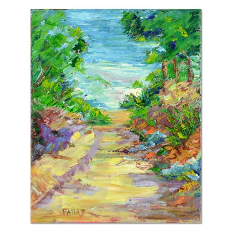"Path Less Taken" is an original oil painting on stretched canvas by Elliot Fallas, hand signed by the artist. Includes letter of Authenticity. Measures approx. 16" x 20" (image).