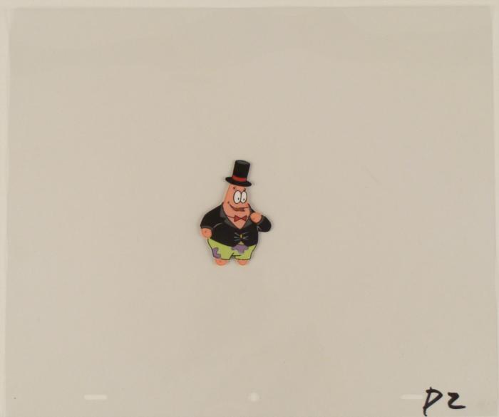To create production cels, the original animator's drawing is transferred onto an acetate cel (by hand-inking and/or photo copying). The cel is then hand-painted on the reverse side. The cel is ready to be matted and framed. The animator's notations are at the bottom of the cel. There is some slight paint fade to Patrick's outline.