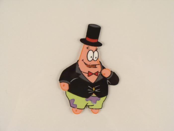 This original animation cel is from the Nickelodeon TV show SpongeBob Squarepants. The story takes place under the deep blue sea in Bikini Bottom, where SpongeBob resides. SpongeBob, who is a yellow, porous sponge, is your typical happy-go-lucky character, as he is always cheerful and enjoys making people laugh. Patrick Star, SpongeBob's neighbor who is a starfish, is your average children's show idiot, as he boasts knowing nothing and is often getting himself into ridiculous situations. Between the homes of these two lies the home of the miserable Squidward, a squid, who is known for being grouchy and playing tricks on SpongeBob and Patrick. Both SpongeBob and Squidward work at the Krusty Krab, a fast food business run by the greedy money-loving Mr. Krabs, a crab, the arch rival of the evil, possibly misunderstood, Plankton. Another neighbor, Sandy Cheeks, an athletic squirrel who normally wears an astronaut's space suit, was introduced in "Tea at the Treedome." She spends most of her time inventing and experimenting. Patrick seems to be in a very good mood.Original Production Animated Cel Overall Size of Cel: 10 1/2" x 12 1/2" Very Good ConditionThis is an original hand-painted cel set-up used in the production of an episode of "SpongeBob SquarePants." Each one-of-a-kind set-up represents a slight change in position of the characters. When individually photographed and projected in rapid succession, the images appear to move.