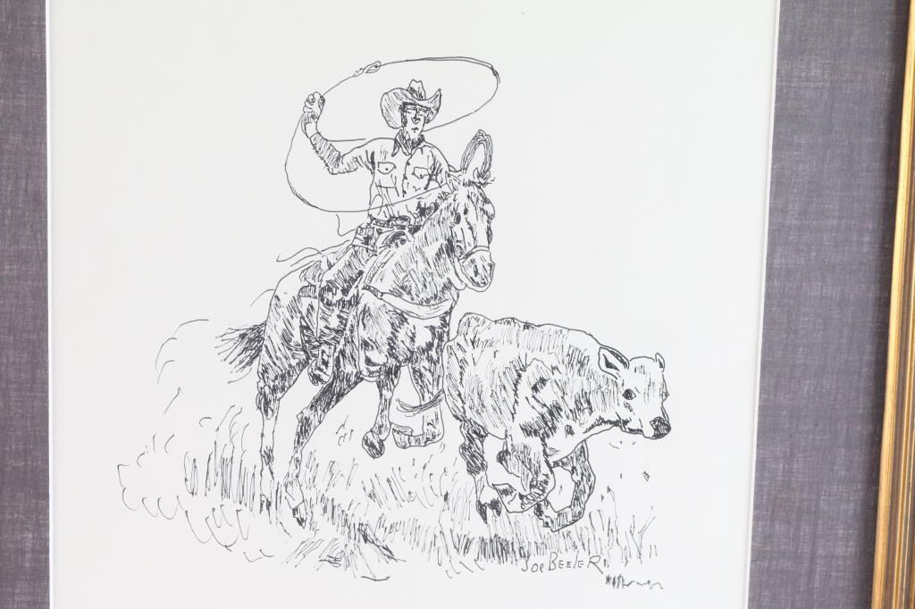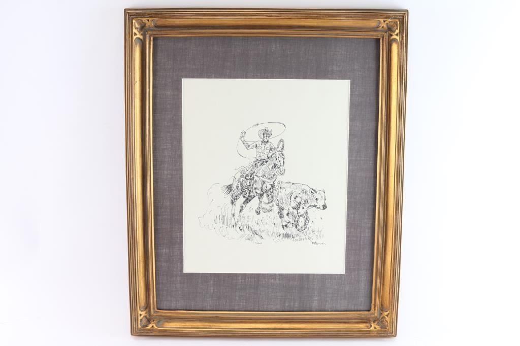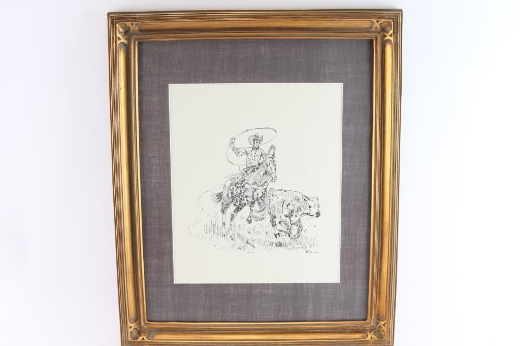 Depicting cowboy lassoing a steer. Signed lower right approximately 9" x 12" with silk matting and museum glass framed. 1950's-60's before Joe co-founded Cowboy Artists of America with Charlie Dye.