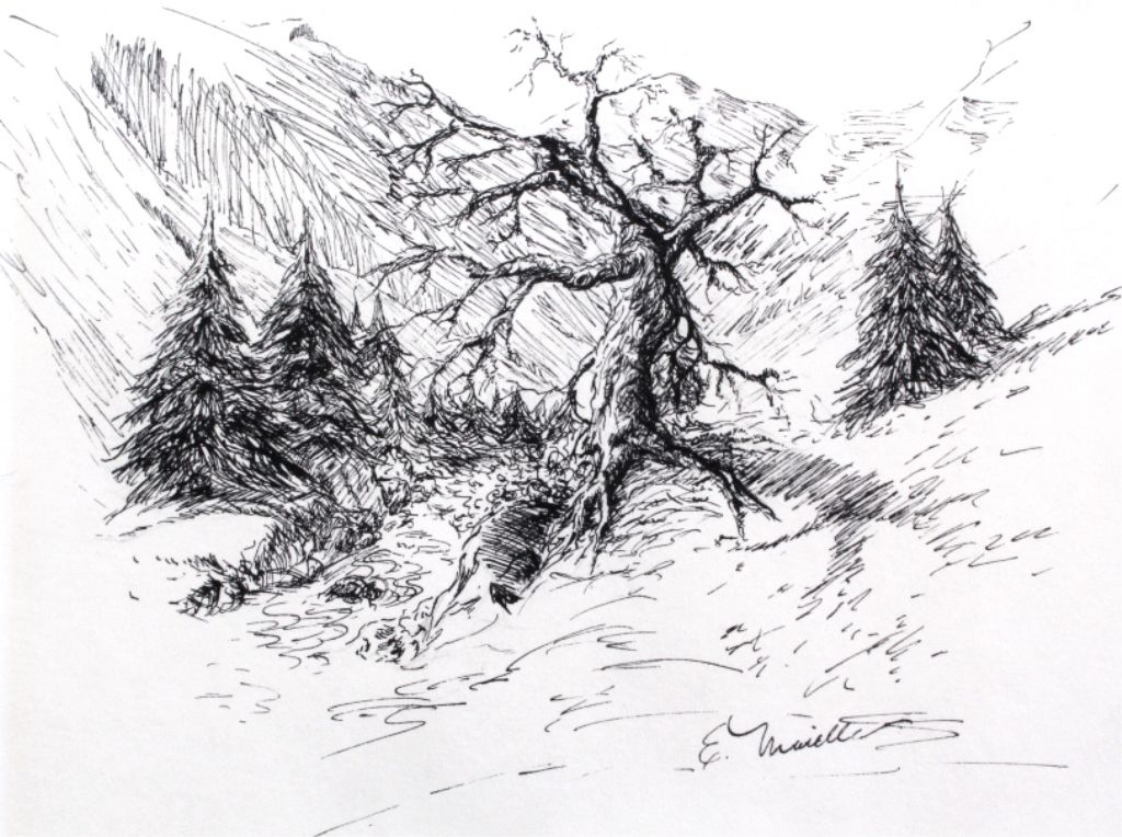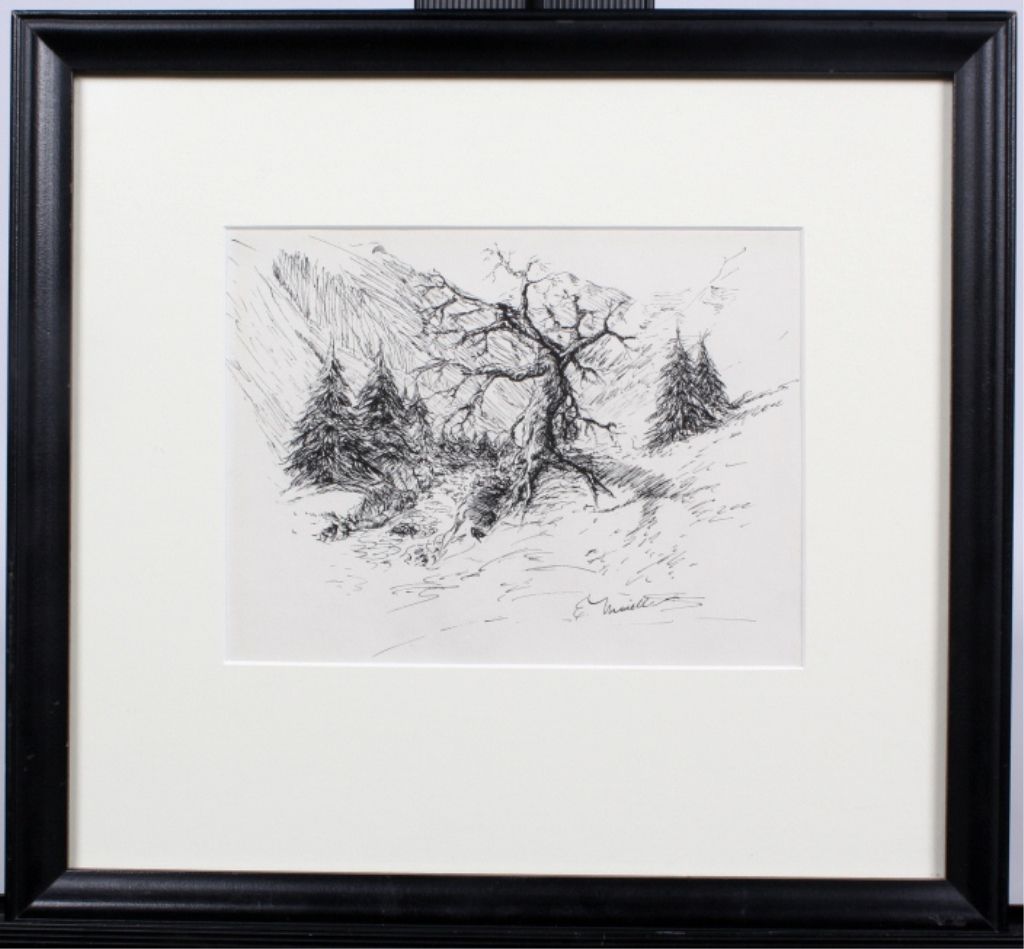 This is an original work of art that is hand signed in the art by the original artist. The artist is unknown, but the subject matter of a mountain scene is fantastic. This has low glare glass acid free matting and framing. This frame measures 11.625"x12.25" ad the artwork is 5.5"x7"
