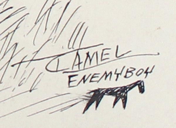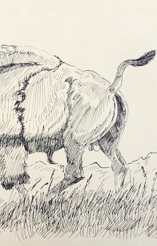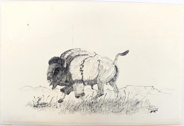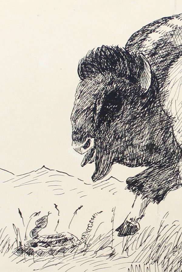 Original Pen Ink Painting of Buffalo Playing with a Rattlesnake, by Camel known as the Enemy Boy. Painting is 12 x 14", we will roll to ship. No frame or matting.