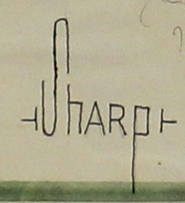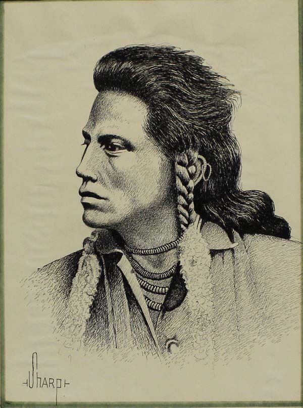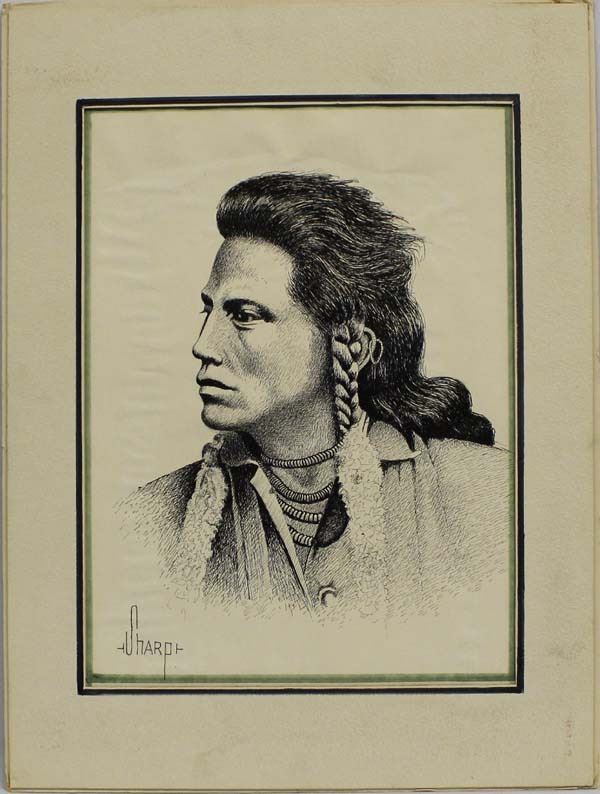 Original Pen & Ink of Native American by Sharp, picture has been glued to mat board so there is rippling in the paper, measures 11.5' x 8.5''